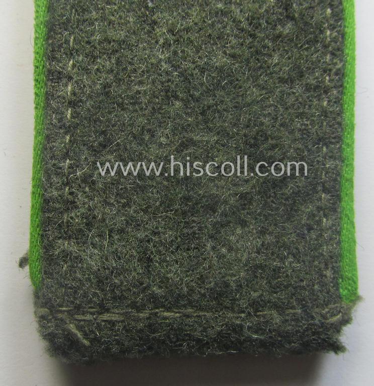 This is an attractive - albeit single but nevertheless fairly scarcely encountered! - WH (Heeres) (I deem) mid-war period- (ie. 'M43'-pattern) enlisted-mens'-type-shoulderstrap as was piped in the desirable bright-green- (ie. 'wiesengrüner'-) coloured branchcolour as was intended for - and most certainly worn by! - a: 'Soldat der Panzer-Grenadier-Truppen' (ie. simple soldier who served within an infantry-related, so-called: rifle-regiment ie. unit) and that comes in an overall nice (albeit just moderately used- ie. worn-), condition. The neat shoulderstrap - which measures 10,7 cms. sized in length - has the field-grey-coloured- and/or woolen-based 'upperdeck' and has the neat (and desirable!) bright-green- (ie. 'wiesengrüner'-) coloured- and/or 'silk-like'-type, piping, attached. The strap comes naturally mounted onto its functional tongue and does show just some minimal wear, usage and/or age. Simply a very attractive - and scarcely found! - EM-type 'Panzergrenadiere'-shoulderstrap that belonged to a: 'Soldat der Panzer-Grenadier-Truppen': too bad that it is only a single specimen!
