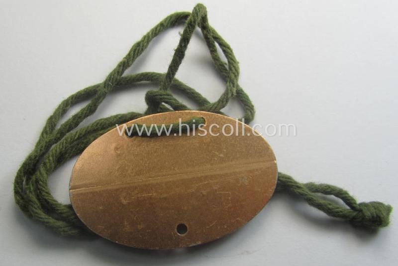 The neat ID-disc (ie. 'Erkennungsmarke') - which is I deem of the typical 'standard-issued'- and/or mid-war-period pattern - bears the engraved coded numeral ie. text that simply reads: 'Kriegsmarine 6792/43K' and that comes in an overall nice- (albeit just moderately used- ie. worn-), condition. The ID-disc - that came mounted onto its green-toned cord as worn - does show some regular wear (it shows somewhat torn-out holes and obvious scratches and/or fair wear). It was, however, never cleaned nor polished and is still a bit dirty: the truly 'bright-coloured'- and frosted golden-bronze-toned finish is, however, still nicely- (ie. almost fully-) preserved. The number '43' almost certainly signifies the year of enlistment (ie. 1943). It should be noted that these 'standard-issue'-pattern and truly decorative KM-related ID-discs (ie. 'Erkennungsmarken') are actually not that easily encountered. Simply an attractive, mid-war-pattern albeit moderately used- and/or worn naval-example that would most certainly merit further investigative work!