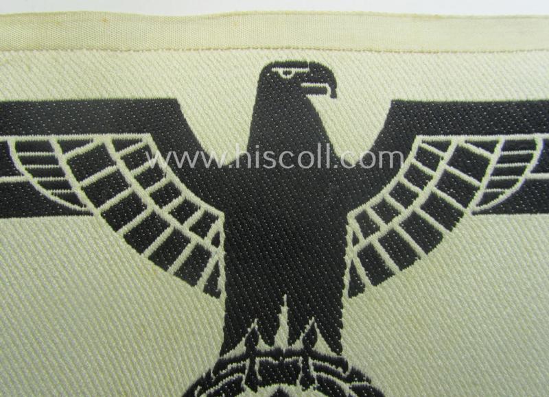 This is an attractive - fairly large-sized- and typically linnen-based - example of a WH 'Heeres'-related sport-shirt badge (ie. 'Brustadler für Sportanzug') as was executed in the neat 'BeVo-weave pattern and that comes in an overall very nice- (ie. simply never used- ie. still 'virtually mint- ie. unissued'- and/or I deem never shirt-attached-) condition. These decorative badges were worn on the specific naval, linnen-based sport-shirts and/or related garments. The badge is of the larger-sized version (measuring: 27 x 14,5 cms.) and is neatly executed in the so-called 'BeVo'-weave technique. The piece - which shows an interwoven, black-coloured national eagle-device on a beige-white-coloured- and/or linnen-based background - is just a tiny bit wrinkled and shows some minor aging ie. staining caused by regular handling and/or storage for decades. It was simply never 'cut'-, trimmed- nor pre-folded and is as stated above just a tiny bit stained caused by decades of storage only. Simply a nice opportunity to acquire a neat 'Heeres'-related sportshirt breast-eagle for a competitive price!