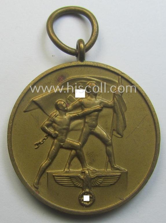 This medal (ie. 'Medaille zur Erinnerung an den 1. Oktober 1938') was awarded to all members of the armed forces that participated in the German occupation of Czechoslovakia that started on: '1. Oktober 1938' and is a very attractive and/or truly very detailed- (most certainly issued albeit never-mounted and simply never worn-) example having great pronounced detail. The medal on offer here has a very nicely preserved (and fully present!) bright golden-bronze-toned finish that is void of any tarnish: it has simply never been cleaned nor polished and truly retains almost all of its period golden-toned- (ie. 'Brennlacquered'-) finish (as can be seen on the pictures). The detailed medal came together with its non-confectioned- (ie. pre-folded- and full length ie. 19 cms.-sized) piece of ribbon (ie. 'Bandabschnitt') and also came together with its period piece of thin-shaped 'wrapping-paper' as issued. Simply an attractive - and complete! - Czech 'Anschluss'-medal that is I deem accordingly priced!