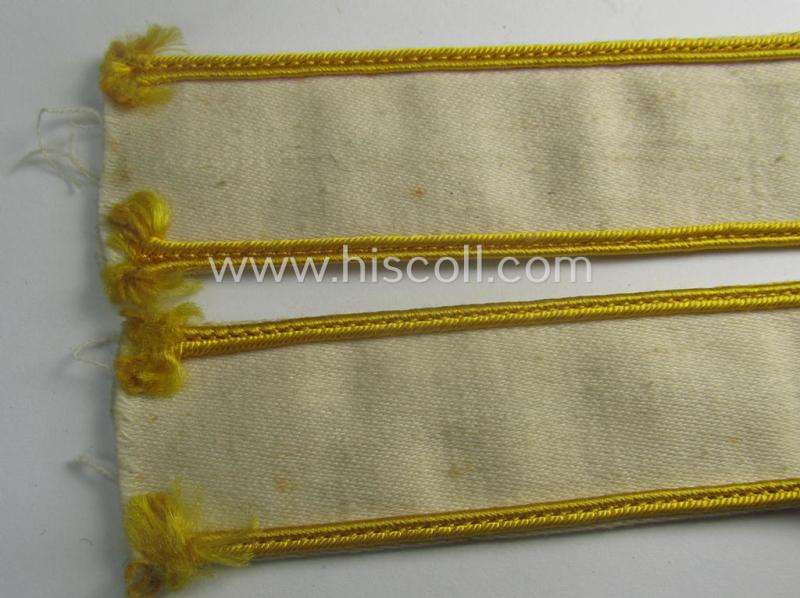 This is a truly very attractive - and/or fully 'textbook'! - example of a WH cuff-title (ie. 'Ärmelstreifen') entitled: 'Kreta' (being an example that bears a seldomly seen, printed 'RbN.'-numeral that reads: 'RBN.0/0250/2340') and that comes in a surely issued albeit simply never worn nor once tunic-attached, condition. The cuff-title comes in a totally non-shortened- ie. full-length condition (ie. it measures approximately 45 cms.) and was as stated above clearly issued but simply never worn. Both ends - which are fortified by some machine-stitching as more often - show some normal fraying as is more often encountered (as can be seen on the pictures). The cuff-title just shows some minimal age ie. staining caused by decades of storage only (as can be seen on the pictures). It should be stated that these 'Kreta'-cuff-titles are not to be regarded as commemorative cuff-titles (such as the 'Afrikakorps' cuff-title) but were regarded as official awards that needed official recognition (and entries in both 'Soldbuch' and/or 'Wehrpass'). Simply a very attractive and naturally genuine, period-example that will be very hard to be upgraded and that is I deem accordingly priced!