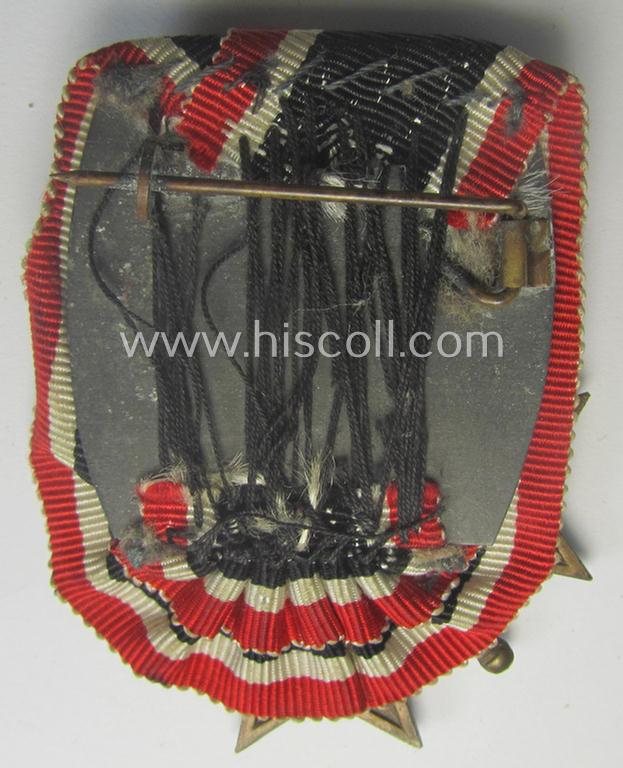 This is a truly attractive example of an - actually fairly unusally seen! - (darkened) golden-bronze-toned, so-called: 'Einzelspange' showing a: 'Kriegsverdienstkreuz II. Klasse mit Schwertern' (or: war-merits' cross 2nd class with swords) being a very detailed- and/or typical 'Buntmetall'-based specimen that has (I deem) been hardly used- nor worn. The detail on this example is extraordinary: it has never been cleaned nor polished and has an attractive and somewhat 'frosted'- (ie. tarnished) age-patina. The medal is 'mounted' onto a metal-based clasp (that is unusually not backed with a piece of wool or linnen) as was intended for wearing this example on a 'going-out'- ie. dress-tunic or 'Waffenrock'. This example retains pronounced details and has a great ie. minimally darkened- ie. tarnished age-patina: it truly retains almost all of its bronze-toned finish (as can be seen on the pictures). The bright-orange-red- (and white-/black-) coloured ribbon shows only minimal usage and/or staining. I could not determine if it is a maker-marked example: the ring is firmly hidden under the ribbon. It should be mentioned that it is actually quite unusual to find a: 'Kriegsverdienstkreuz II. Klasse mit Schwertern' mounted as an: 'Einzelspange'!
