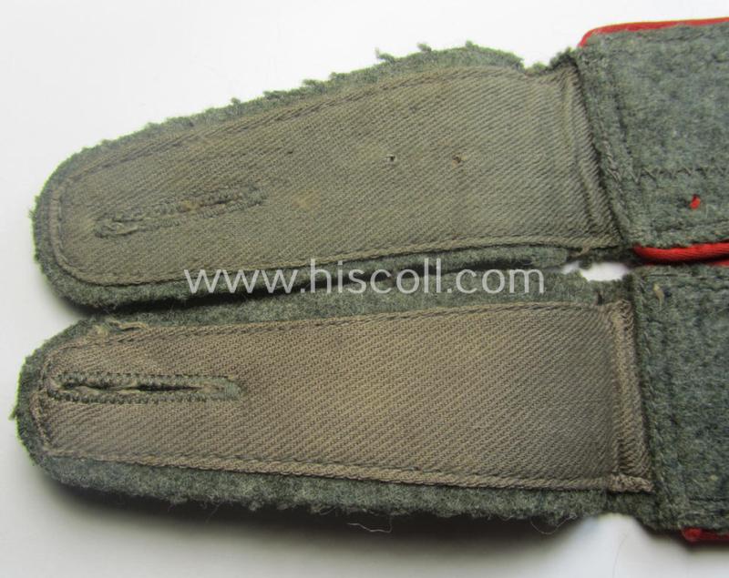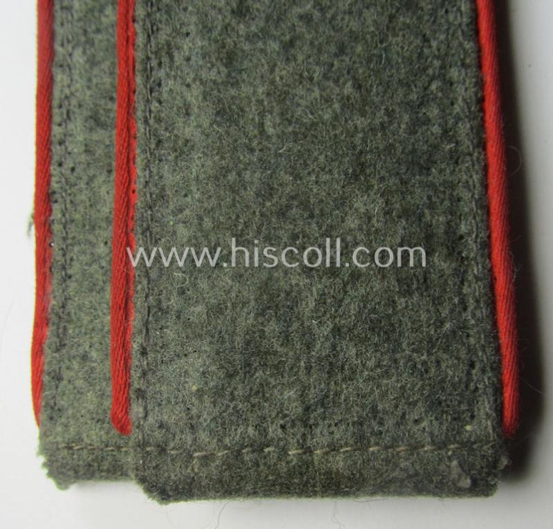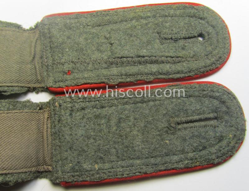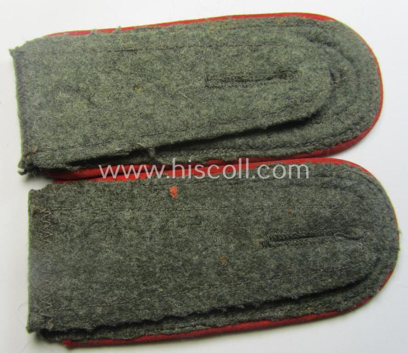 This is an attractive - just moderately used and/or fully matching! - pair of typical 'standard-issued'- (ie. non-'tailor-made'-) pattern, WH (Heeres) mid-war-period- (ie. 'M43'-pattern) enlisted-mens'-type shoulderstraps (ie. 'Schulterklappen für Mannschaften des Heeres') as was piped in the desirable bright-red- (ie. 'hochroter'-) coloured branchcolour as was specifically intended for usage by a: 'Soldat eines (Sturm)Artillerie-Abteilungs o. Regiments' (or: simple soldier who served within an artillery unit or regiment) and that comes in an overall very nice- (ie. I deem just moderately used- ie. worn-), condition. The neat straps - which have the 'standard'-pattern, field-grey-coloured and/or typical woolen-based 'upperdecks' and that measure approximately 11 cms. in length each - show the neat bright-red- (ie. 'hochroter'-) coloured and/or desirable silk-like-type piping attached (as can be seen on the pictures). The straps come naturally mounted onto their period (regular-shaped) tongues attached and come both in a very nice- (ie. fully 'text-book') condition overall (as can be seen on the pictures). The pair only shows moderate wear and/or age and is just very nicely preserved (as can be seen on the pictures). This neat shoulderstrap-pair was found together with the '(Sturm)Artillerie'-related collar-tab-pair I offer under number: 69818: both insignia-sets belonged to the same soldier who wore these and stored these for decades. I deem this an excellent occasion to acquire a neat EM-type, non-privately-purchased '(Sturm)Artillerie'-related shoulderstrap-pair for a justified price!