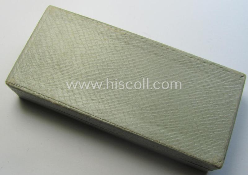 The attractive medal - which is a typical non-maker-marked specimen as executed in light-weight (ie. aluminium-based- and quite shiny) metal as more often encountered - comes mounted onto its (minimally confectioned, neatly pre-folded- ie. full-sized) ribbon (ie. 'Bandabschnitt') and comes in an overall very nice- (ie. I deem simply never worn- nor used- ie. 'still virtually mint'- ), condition. The awardl is (I deem) never used nor worn (it only shows some minimal dust simply caused by years of storage only) but retains stunning detail (and was most certainly never cleaned nor polished). The greyish-blue- (ie. dove-grey) coloured etui (which is truly scarce in itself!) - comes in an equally very nicely preserved condition and is naturally fully functional: it shows no damage whatsoever but does show some minimal staining ie. usage- (ie. storage-) marks only. The etui naturally retains a fully present, black-coloured, imprinted text on its top (as can be seen on the pictures). Simply an attractive, non-maker-marked 'Luftschutz-Ehrenzeichen 2. Stufe'-medal-set that will be very hard to be upgraded and that is accordingly priced!