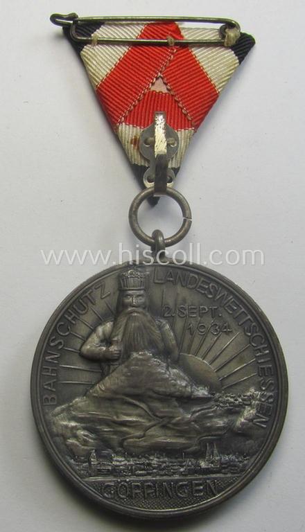 Most certainly unusually found, silver-toned, 'Bahnschutz'- (ie. railway-protection-service-) related commemorative shooting-contest medal entitled: 'Bahnschutz Landeswettschiessen - Göppingen - 2.Sept. 1934'