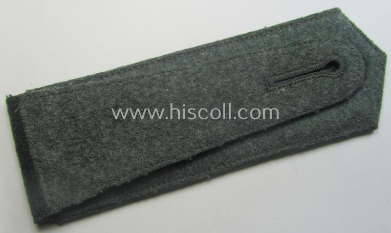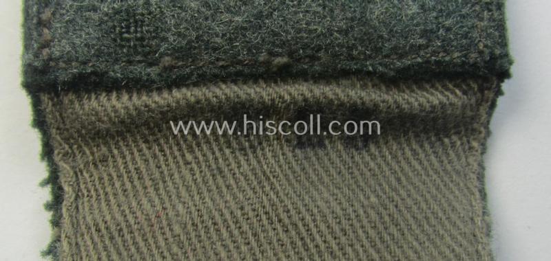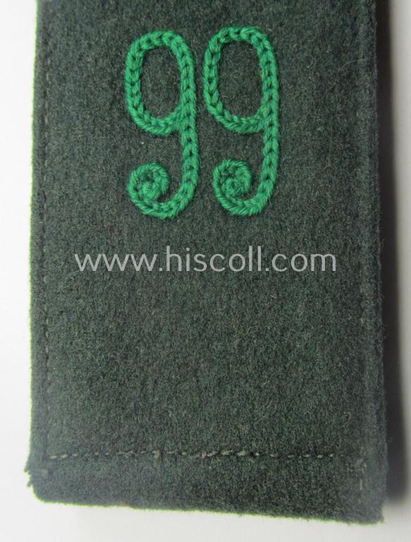 This is a very attractive - regrettably single but nevertheless actually truly scarcely found! - WH (Heeres) early-war-period, so-called: 'M36-/M40'-pattern- (pointed-styled) 'cyphered', enlisted-mens'-type (and as per regulation, non-piped!) shoulderstrap as was intended for - and clearly worn by! - a: 'Soldat des Gebirgsjäger-Regiments 99' (or: simple soldier who served within the army mountain-troops regiment, numbered: '99') and that comes in an overall very nice- (albeit moderately used ie. clearly worn-), condition. The shoulderstrap - which is approximately 13 cms. sized in length - has the 'standard-type'- and/or darker-green-coloured, smooth-woolen-based 'upperdeck' and shows the neat (machine-embroidered by means of so-called: 'Kurbelstickerei') double, so-called: '9'-cyphers ie. numerals (or: 'Ziffern'). Both 'cyphers' are executed in the darker-green- (ie. 'grüner'-) coloured wool ie. linnen as to be expected (as can be seen on the pictures). The strap - which came mounted onto its functional tongue - shows as stated above some moderate usage and/or wear (some minor staining and/or dust is visible and/or present). It should be noted that all 'cyphered'-pattern, WH (Heeres) shoulderstraps can easily be regarded 'fairly scarce'. This shoulderstrap originated from an older 'Gebirgjäger'-related shoulderstrap ie. board-collection that I recently acquired for the web-site. Simply an attractive and/or: early-war-period, neatly 'cyphered' and/or 'Heeres'-related EM-type shoulderstrap that was intended for usage by a: 'Soldat des Gebirgsjäger-Regiments 99': too bad that it is only a single specimen!