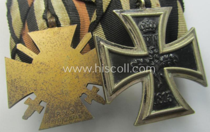 This is an attractive - and I deem just moderately used- and/or worn! - example of a WWI-period, so-called: 'Doppelspange' (ie. 'Doppelspange') being of the 'non-detachable-pattern' and that is respectively showing an: 'Eisernes Kreuz II. Klasse' (or: iron cross second class) and a WWI-period: 'Frontkämpferkreuz 1914-18 mit Schwertern' (ie.: 'Kriegsteilnehmerkreuz 1914-18 mit Schw.') and that comes as issued, moderately worn and/or recently found. The detail on the 'EKII. Klasse' is truly nicely preserved: it has - I deem - never been cleaned nor polished and has an attractive and/or minimally tarnished age-patina (as can be seen on the pictures). It retains nice details and has a nicely preserved, black-finished (ie. somewhat 'satin-like'- ie. 'shiny-style') core and is void of any real damage or paint-loss. The 'FKK 1914-18' shows a clear makers'-designation on its back that reads: 'R.V. 9 - Pforzheim' (as can be noticed on the pictures). The detail on this award is also nicely preserved but it does show some tarnished age-patina and some minimal staining (as can be seen on the pictures). Both awards - which show their nicely preserved, period ribbons - come both 'period-mounted' onto a chromed-metal-based 'clasp' (that is neatly 'backed' with orange-toned wool and that shows a functional pin- ie. catch-set-up) as was intended for wearing this example on a 'going-out'- ie. dress-tunic or 'Waffenrock'. Simply an attractive WWI-period, 'Doppelspange' that is with certainty accordingly priced!