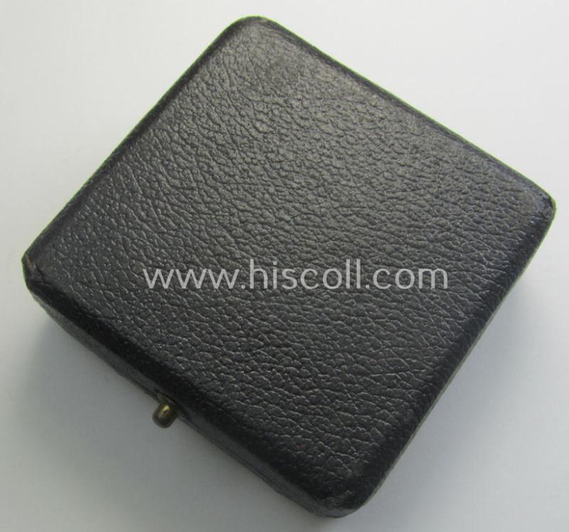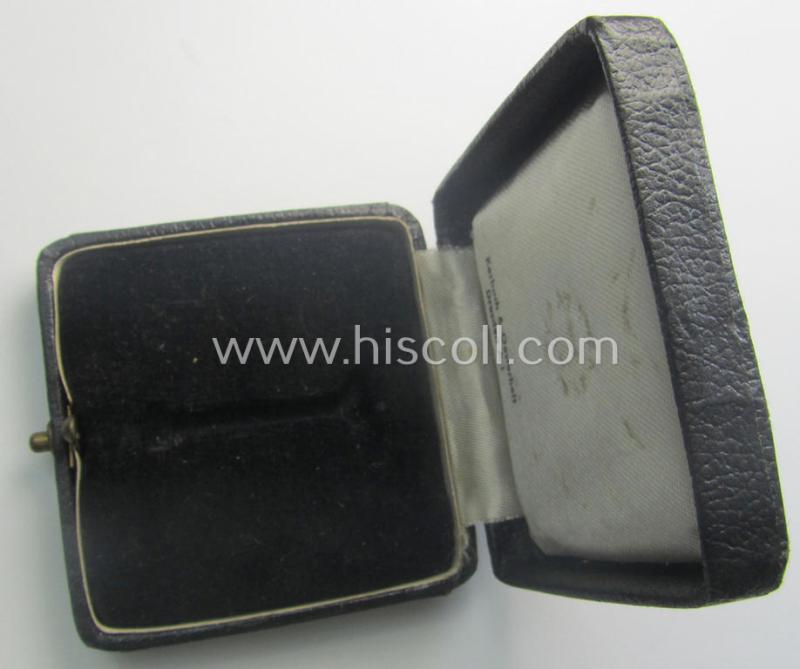 This is an attractive - albeit regrettably empty! - fairly luxuriously-styled (and neatly 'domed') etui as was specifically intended to store a: 'Kriegsverdienstkreuz 1. Klasse mit Schwertern' (or: war-merits'-cross first-class with swords) and that comes in an overall very nicely preserved- and/or fully untouched, condition. The etui comes in a very fine and fully complete (and/or untouched!) condition: the very detailed, silver-toned decal representing the cross that figures on the etui's top is in a very nice and totally undamaged condition whereas the black-coloured- (and velvet-like) interior is also fully present and in place (it does, however, show some minimal age and/or staining and does show a (vaguely-present) imprint of the cross it once held (as can be seen in the pictures). The inside of the top-lid shows the makers-designation: 'Kerbach & Oesterhelt - Dresden A1' printed into its lid (as can be seen on the pictures). I deem that this attactive - and most certainly desirable! - 'KvKI.Kl. m. Schwn.'-etui is accordingly priced: it just needs an equally nicely preserved KVK first-class to complete!