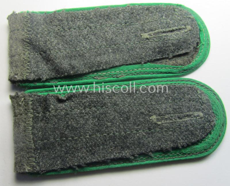 This is a truly attractive - quite rarely found and fully matching! - typical later-war-period, so-called: 'M44'-pattern- and somewhat simplified WH (Heeres) NCO-type shoulderstrap-pair as was piped in the neat darker-green- (ie. 'grüner'-) coloured branchcolour as was specifically intended for usage by an: 'Unteroffizier eines Jäger- o. Gebirgsjäger-Regiments' (or: NCO ie. junior-sergeant who served within an army mountain-trooper-related unit) and that comes in an overall very nice- (I deem hardly used- nor worn-), condition. The shoulderstraps - which measure approximately 11,5 cms. in length each as more often seen - have the neat (and desirable!) rayon-type piping attached (as is more encountered with these later-war-period shoulderstraps). The shoulderstraps are constructed following the typical '1944 cloth-minimising production-manner', using different shades of (partly Italian-styled!) wool and/or material (as can be seen in the pictures). The straps show the (typical) bluish-grey-coloured (ie. truly sub-dued) NCO-braid attached and come naturally mounted onto their functional tongues. It should be noted that all 'M44'-pattern, NCO-type straps are actually quite hard to find and can easily be graded 'scarce': even more so when they are piped in the desirable, darker-green- (ie. 'grüner'-) coloured branchcolour. Simply an attractive - and/or fully 'text-book'! - M44-pattern NCO-type 'Jäger- o. Gebirgsjäger'-shoulderstrap-pair that was intended for usage by an: 'Unteroffizier'!