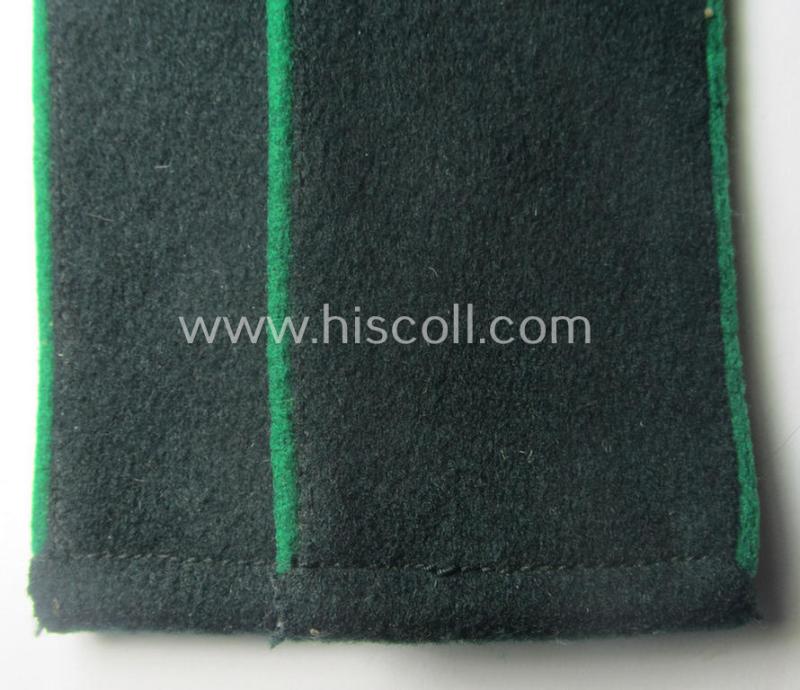 The truly very attractive - most certainly rarely encountered, fully 'text-book' and in all respects matching! - pair of 'standard-issued'- (ie. most certainly 'non-privately-purchased'!) pattern, WH (Heeres) enlisted-mens'-type shoulderstrap-pair is piped in the desirable, neat green- (ie. 'grüner'-) coloured branchcolour and measures approximately 11,5 cms. in length each. The straps have the desirable green- (ie. 'grüner'-) coloured- and/or: typical woolen-type piping attached (as is more often encountered with these early-war-period shoulderstrap-pairs) and was as such intended for usage by a: 'Soldat eines Jäger- o. Gebirgsjäger-Regiments' (or: simple soldier who served within a mountain-troops-related regiment). The shoulderstraps are typical 'standard-issued'-examples that have the darker-green-coloured- and/or (smooth)woolen-based 'upperdecks': they were - I deem - just minimally used ie. worn and do show some truly minimal wear, age and/or staining (as can be seen on the pictures). The straps come naturally mounted onto their functional tongues. These very desirable 'M40- o. 41'-pattern, army 'Jäger- o. Gebirgsjäger'-related EM-type shoulderstraps as piped in the green- (ie. 'grüner'-) coloured branchcolour can nowadays easily be graded 'rare' and are very desirable. Simply a very attractive - and fully matching! - shoulderstrap-pair that belonged a: 'Soldat eines Jäger-o. Gebirgsjäger-Regiments' and that is priced according to its unmistaken rarity and/or desirability!