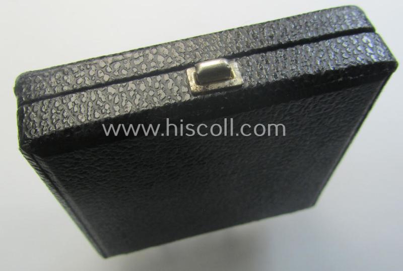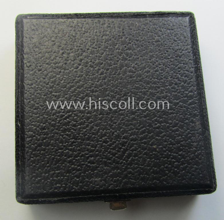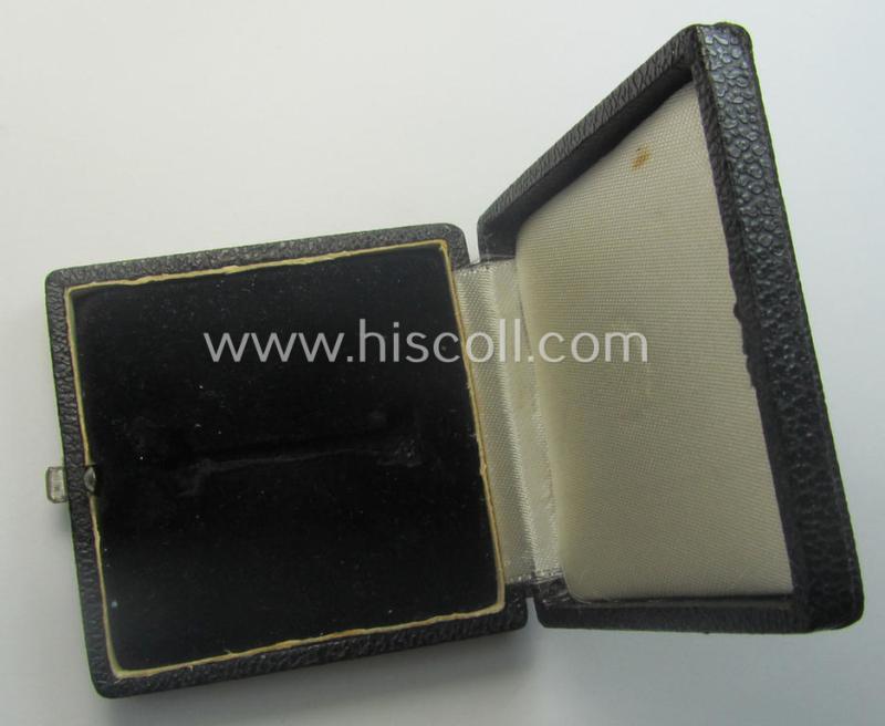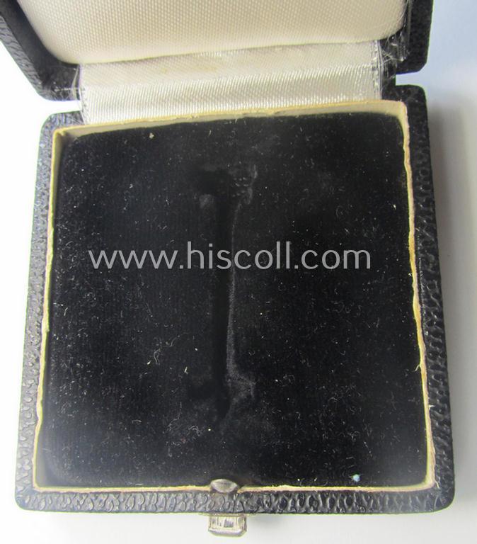 This is an attractive - albeit regrettably empty! - fairly luxuriously-styled (albeit 'generic'-styled!) etui as was specifically intended to store a: 'Kriegsverdienstkreuz 1. Klasse mit Schwertern' (or: war-merits'-cross first-class with swords) and that comes in an overall very nicely preserved- and/or fully untouched, condition. The etui comes in a very fine and fully complete (and/or untouched!) condition: the very detailed, silver-toned decal representing the cross that figures on the etui's top is in a very nice and totally undamaged condition whereas the black-coloured- (and velvet-like) interior is also fully present and in place (it does, however, show some minimal age and/or staining and does show a (vaguely-present) imprint of the cross it once held (as can be seen in the pictures). The etui is totally void of a makers'-designation (as can be seen on the pictures). I deem that this attactive - and most certainly desirable! - 'KvKI.Kl. m. Schwn.'-etui is accordingly priced: it just needs an equally nicely preserved KVK first-class to complete!
