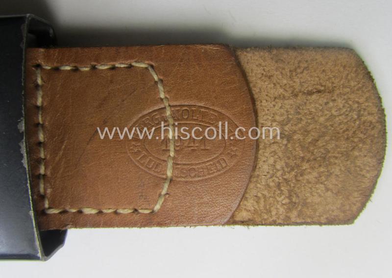 This a truly very attractive - and I deem simply never ie. hardly worn! - example of a WH (Luftwaffe) 'standard-pattern', bluish-grey-toned- and/or typical steel-based belt-buckle (ie. 'Koppelschloss für Unteroffiziere u. Mannschaften der Luftwaffe') being a (typical) non-maker-marked example that comes mounted onto its (neatly!) marked leather-based tab (that shows the clearly stamped makers'-designation: 'Berg u. Nolte A.G. - Lüdenscheid' and/or date-designation: '1941') and that comes as recently found and/or stored for decades. The buckle truly retains almost all of its (typical) bluish-grey- (ie. darker-blue-) coloured sprayed surface (just some regular ie. minimal paint-loss is noticable something that is more often encountered). The piece shows an impressed (oval-shaped and impressed) stamp on the leather-based tab (as can be seen on the pictures). The stamp shows the producing-company (ie. 'Berg u. Nolte A.G. - Lüdenscheid') and the year of production '1941' (as can be seen on the pictures). The buckle - which itself is void of a makers'-designation - came mounted onto its equally mint and souple - and of course still functional - brownish-coloured and genuine leather-based 'tab' (as can be seen on the pictures). The piece was simply never cleaned nor polished and does still shows some minimal dust ie. handling-age (as can be noticed on the pictures). I deem that I have priced this still 'virtually mint' and fully untouched, WH (Luftwaffe) belt-buckle, accordingly!