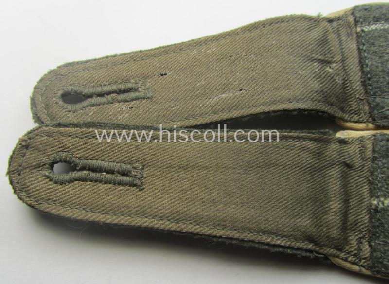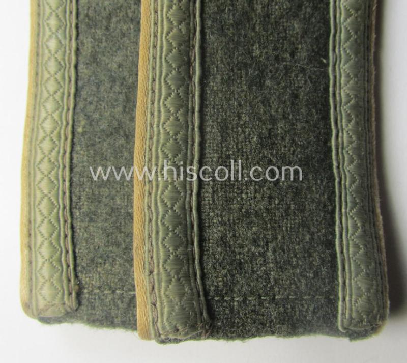 This is a truly attractive - just moderately used and/or fully matching! - pair of 'standard-issue'-pattern, WH (Heeres) early- (ie. mid-) war-period- (ie. 'M40- o. M43'-) pattern NCO-type shoulderstraps (ie. 'Schulterklappen für Unteroffiziere des Heeres') as piped in the white- (ie. 'weisser'-) coloured branchcolour as was intended for - and clearly worn by! - an: 'Unteroffizier eines Infanterie-Regiments' (or: NCO ie. junior-sergeant who served within an infantry-regiment ie. unit) and that comes in an overall very nice- (ie. clearly used- ie. worn- and/or tunic-removed-), condition. The straps - which are both approximately 10,8 cms. sized in length - have the 'standard-pattern'- and/or: field-grey-coloured, woolen-based 'upperdecks' and have as stated above the desirable 'silk-like'-type- and/or white- (ie. 'weisser'-) coloured branchcolour ie. piping attached (as can be seen on the pictures). The shoulderstraps show the ('standard'-issue-pattern) bluish-grey-coloured (and neatly 'sub-dued'!) NCO-braid attached denoting that the pair was intended for an NCO holding the rank of: 'Unteroffizier'. The pair - that shows some obvious albeit minimal wear - comes mounted onto its original tongues and does just show some moderate age and/or staining (as can be seen on the pictures). Simply a very attractive early- (ie. mid-) war-period, 'Heeres' NCO-type, 'Infanterie'-related shoulderstrap-pair that belonged to an: 'Unteroffizier eines Infanterie-Regiments': I deem that I have priced this very attractive - and by all means 'text-book'! - pair accordingly!