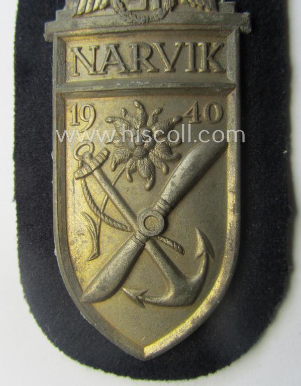 WH (Kriegsmarine) 'Narvik'-campaign-shield being a detailed example as executed in (light) golden-toned zinc- (ie. 'Feinzink') and that comes in an issued- (and/or moderately worn- ie. once tunic-attached-), condition