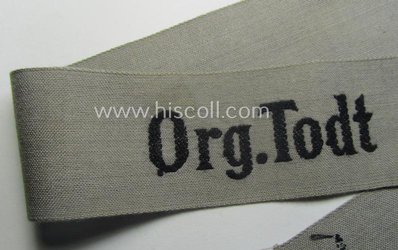 OT (ie.: 'Organisation Todt') greyish-coloured, enlisted-mens'- (ie. NCO-) pattern cuff-title (ie. 'Ärmelstreifen für Mannschaften u. Unteroffiziere') being a moderately used- ie. tunic-removed example depicting the text: 'Org.Todt'