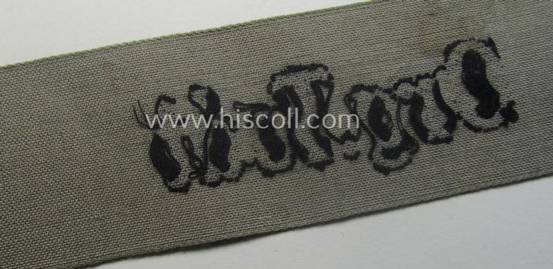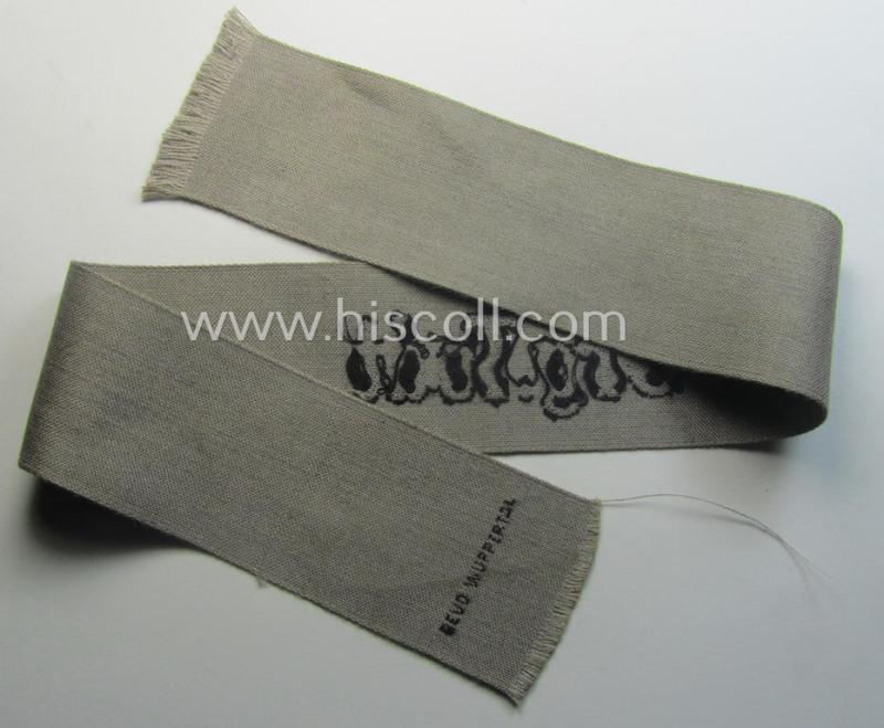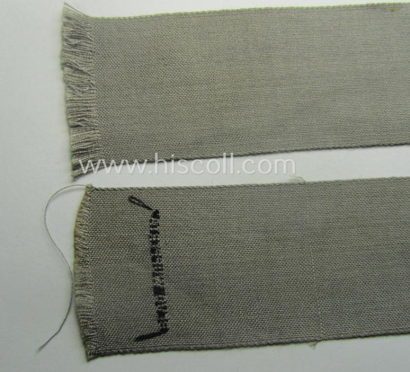 This is an attractive - and with certainty not that easily found! - (I deem) somewhat early-pattern example of an: OT (ie.: 'Organisation Todt') greyish-coloured, enlisted-mens'- (ie. NCO-) pattern cuff-title (ie. 'Ärmelstreifen für Mannschaften u. Unteroffiziere') being a moderately used- ie. worn- (and carefully tunic-removed!) example depicting the text: 'Org.Todt' and that comes in an overall very nice- (and as stated just moderately used- and I deem carefully tunic-removed-), condition. The cuff-title - which comes in a full-length condition and that has two unfinished ends - is not folded and measures approximately 42 x 3,8 cms.: it is just a tiny bit stained and is somewhat wrinkled (can be seen on the pictures). This example shows an interwoven so-called: 'BeVo-Wuppertal'-text- ie. logo (as can be seen on the pictures). This type was also seen worn in conjunction with a swastika 'Armbinde'. Simply an attractive - and actually quite unusually encountered! - TR-era, EM- (ie. NCO- )type- and early-pattern: 'Org.Todt'-cuff-title that will be very hard to be upgraded!