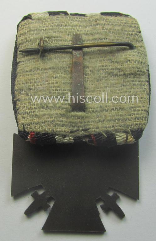 This is an attractive example of an - actually quite unusally seen! - golden-bronze-toned, so-called: 'Einzelspange' (or single-pieced medal-bar) showing a WWI-period: 'Frontkämpferkreuz 1914-18 mit Schwertern' (ie.: 'Kriegsteilnehmerkreuz 1914-18 mit Schwertern') that comes with an (unusally seen!) swords-device attached and that has (I deem) been hardly used- nor worn. The piece is a detailed- and/or zinc- ie. 'Feinzink'-based, specimen that is neatly maker-marked on its back: it bears the makers'-designation: 'O & B' (as can be seen on the pictures). The detail on this example is extraordinary: it has never been cleaned nor polished and has an attractive and somewhat 'darkened'- (ie. tarnished) age-patina. The medal is 'mounted' onto a chromed-steel-based clasp that its neatly 'backed' with greyish-coloured wool (with functional pin/catch) as was intended for wearing this example on a 'going-out'- ie. dress-tunic or 'Waffenrock'. This example retains pronounced details and has a great ie. only minimally darkened- ie. tarnished age-patina: it truly retains all of its bronze-toned finish (as can be seen on the pictures). The multi-coloured ribbon shows only minimal usage and/or staining. It should be mentioned that it is actually quite unusual to find a: 'Frontkämpferkreuz 1914-18 mit Schwertern' mounted as an: 'Einzelspange'!