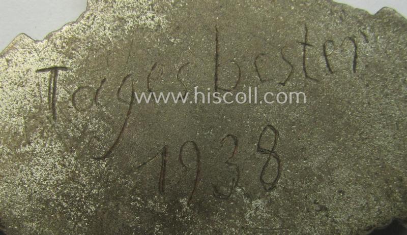 Most certainly unusually found, silver-toned (and neatly enamelled!) commemorative shooting-contest-medal that shows the period-engraved text: 'Tagesbester 1938'