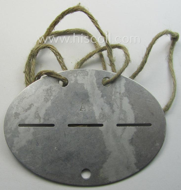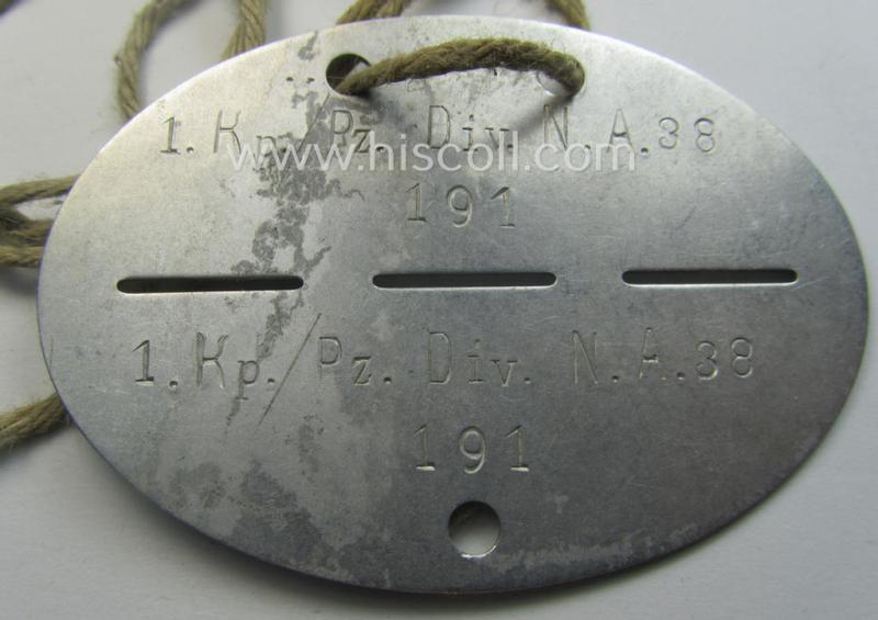 Aluminium-based, WH (Heeres) 'Panzer-Nachrichten'-related ID-disc bearing the clearly stamped unit-designation that reads: '1.Kp./Pz.Div.N.A.38' and that comes mounted onto its period cord as issued and/or worn