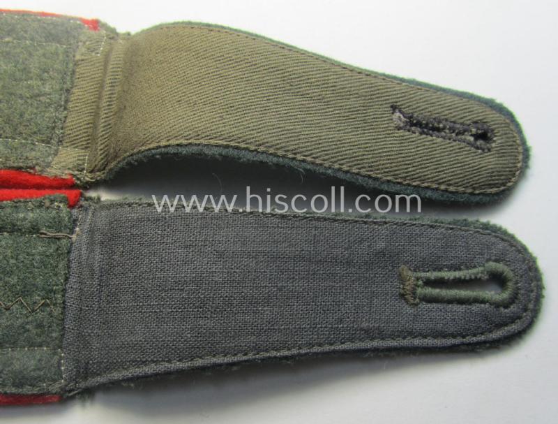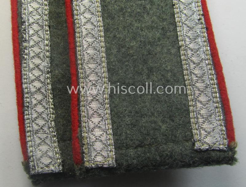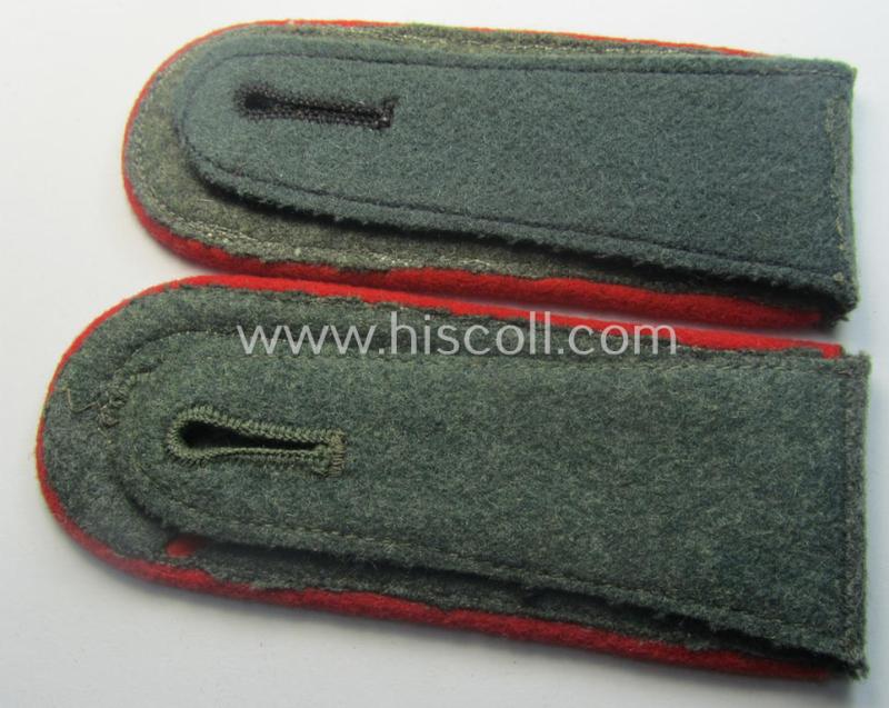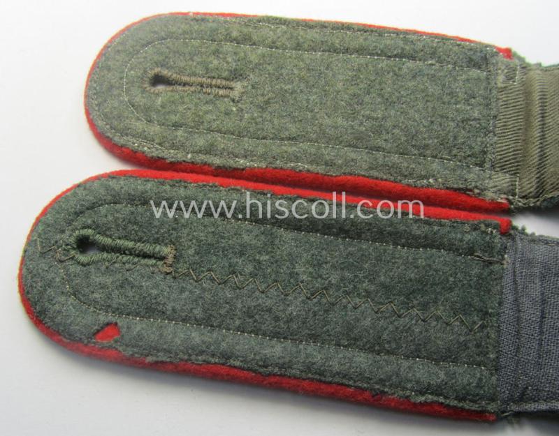 This is an attractive - just moderately used and/or fully matching! - pair of typical 'standard-issued'- (ie. non-'tailor-made'-) pattern, WH (Heeres) early- (ie. mid-) war period- (ie. 'M40'- ie. 'M43'-pattern) NCO-type shoulderstraps (ie. 'Schulterklappen für Unteroffiziere des Heeres') as was piped in the desirable bright-red- (ie. 'hochroter'-) coloured branchcolour as was specifically intended for usage by an: 'Unterwachtmeister o. Unteroffizier eines (Sturm)Artillerie-Abteilungs o. Regiments' (or: junior-sergeant who served within an artillery unit or regiment) and that comes in an overall very nice- (ie. I deem just moderately used- ie. worn-), condition. The neat straps - which have the 'standard'-pattern, field-grey-coloured and/or typical woolen-based 'upperdecks' and that measure approximately 11,7 cms. in length each - show the neat bright-red- (ie. 'hochroter'-) coloured and/or woolen-type piping attached (as can be seen on the pictures). The straps - that show the typical silverish-grey-toned (ie. minimally sub-dued) NCO-braid attached - come naturally mounted onto their period (regular-shaped) tongues attached and come both in a very nice- (ie. fully 'text-book') condition overall (as can be seen on the pictures). The pair only shows minimal wear and/or age and is just very nicely preserved (as can be seen on the pictures). I deem this an excellent occasion to acquire a neat NCO-type, non-privately-purchased '(Sturm)Artillerie'-related shoulderstrap-pair for a justified price!