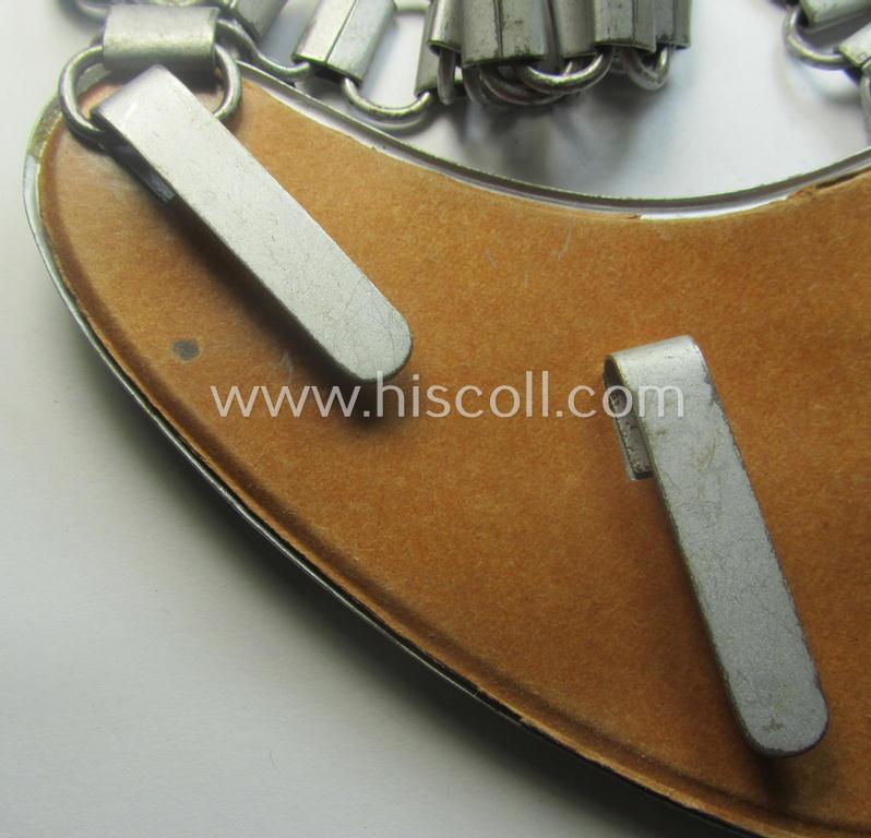 This is a truly very attractive - and actually scarcely encountered! - WH (Heeres) gorget (ie. 'Brustschild o. Ringkragen') entitled: 'Feldgendarmerie' (as was intended for usage by the various army field-police-officials) being a non-maker-marked example that comes mounted onto its period-attached chain (ie. 'Kette') as issued and that comes in a truly minimally used- ie. hardly worn- (ie. still 'virtually mint'-), condition. The neatly silver-toned piece is very detailed and very pronounced in execution: it was (I deem) only minimally used ie. worn and is void of any real damage or alike: it has a fully preserved painted surface that is void of any (paint)damage as can be seen on the pictures. The piece shows extraordinary detail and shows some minimal age and/or slight staining (as can be seen on the pictures). The attractive gorget (which still shows its period-attached, beige-coloured- and/or carton-based 'backing' in place) came with its (non- ie. partly-detachable) chain that fully retains its silver-toned- and/or steel-based 'chains' (as can be seen on the pictures). The piece retains very nicely preserved (ie. fully present!) luminous-painted details ( as can be seen on the pictures). Simply a very attractive - and nowadays truly scarcely encountered! - field-police- ie. 'Feldgendarmerie'-related equipment-item that comes in a wonderful condition: most certainly one of the best such examples I ever had on offer!