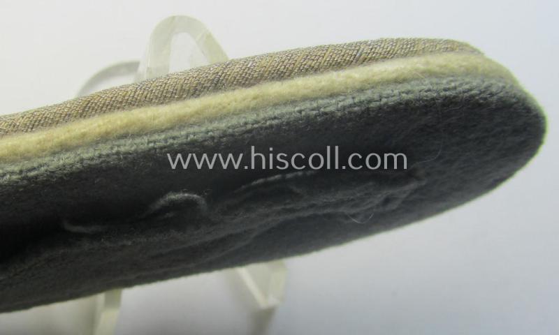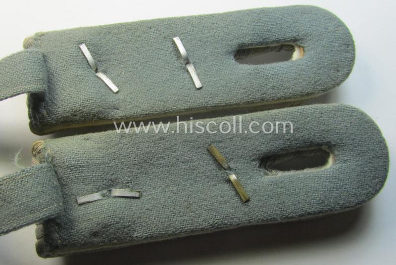 The attractive pair is neatly (dual)piped in the white- (ie. 'weisser'-) coloured branchcolour and has the typical dove-grey-coloured 'underlay' and was intended for - and/or with certainty worn by! - a: 'Hauptmann der Infanterie-Truppen' (or: reserve-captain who served within the 'Infanterie'- ie. infantry-troops) and comes in an overall very nice- (albeit just moderately used-, worn- and/or: carefully tunic-removed-), condition. The shoulderboards are 'text-book'-examples of the 'Heeres'-type, 'Infanterie'-shoulderboards and have the silver-coloured (ie. somewhat 'sub-dued'-pattern) 'upperdecks' (as can be noticed on the pictures). The boards show the desirable white- (ie. 'weisser'-) coloured branchcolour and have the typical dove-grey-coloured 'underlay' (and were constructed from the typical 'smooth'-type wool as to be expected). The boards come mounted onto their typically smaller-sized tongues and were clearly used as such (as can be seen on the pictures). The boards measure approximately 11,3 cms. in length each and were most certainly issued- and/or worn as such and does show moderate age, wear and/or staining as to be expected. The pair - that was recently found at a German private-household - shows two fully matching sets of (neatly bright-golden-toned- and regular-sized) pips, period-attached. All four devices are just minimally stained- ie. tarnished but have preserved a fine and fairly bright- (and/or quite shiny!) age-patina. Simply a very attractive set that belonged to a: 'Hauptmann der Infanterie-Truppen'!