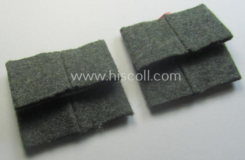 I recently found two - fully matching and identical! - pairs of the WH (Heeres) 'Veterinäre'-related, so-called: regimental shoulderstrap-'slip-ons' (ie. 'Schulterstück-Überschuben') as was intended for usage by a: 'Soldat des Veterinär-Abteilungs 12' and that come both in a wonderful- (and I deem simply never worn- nor used-), condition. Both pairs are neatly 'machine-stitched'-embroidered (by means of so-called: 'Kurbelstickerei') in the typical darker-red- (ie. 'karmesinroter'-) coloured wool and do both show some minimal storage-age only. It should be noted that this darker-red- (ie. 'karmesinroter'-) coloured branchcolour is one of the hardest to encounter 'Waffenfarben' within the entire 'Deutsche Wehrmacht'. My asking-price is naturally intended per single pair. Simply an attractive pair of 'Veterinäre'-related- (ie. army-veterinarian-) related 'Überschuben' that is - I deem - accordingly priced: great to 'decorate' a pair of 'karmesinroter'-piped 'Heeres'-shoulderstraps or ideally fitted to keep in any insignia-collection!