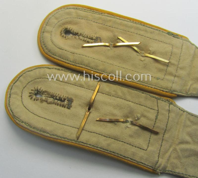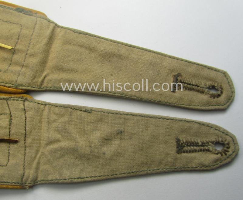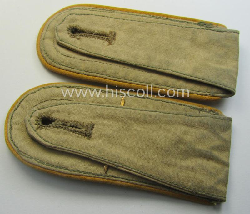 This a very attractive pair of - truly used- and/or worn! - WH (Luftwaffe) 'tropical-styled' NCO-type shoulderstraps which are both approximately 10,4 cms. sized in length and that come in an overall nice- (albeit clearly (sun)faded- ie. minimally stained condition): both pieces show the neat golden-yellow- (ie. 'goldgelbener'-) coloured branchcolour (ie. 'silk-like'-type piping) attached and were as such intended for usage by a sergeant first-class who served within the Luftwaffe pilots' ie. paratroopers-branch (ie. 'Flieger- o. Fallschirm-Truppen'). The attractive straps - which are both executed in the regular - albeit slightly 'thicker'-styled- and/or: somewhat more smooth-like linnen - come naturally mounted onto their functional tongues. Both pieces have the typical (light-bluish-grey-coloured- ie. typical Luftwaffe-styled, dotted-pattern) NCO-braid and four (fully matching, aluminium-based, smaller-sized) pips attached as to be expected (as can be seen on the pictures). The pair shows some obvious wear and/or staining as can be noticed on the pictures (but is, nevertheless, fully undamaged). Of additional interest is naturally the fact that this pair is matching in all facets: something that is most certainly not always the case with these WH (Luftwaffe) 'tropical-styled' NCO-type shoulderstraps. It should be noted that these LW tropical-styled, NCO-type shoulderstraps can easily be considered 'scarce': even more so when they come in such a neat and/or fully untouched, condition: I deem that I priced this neat pair, accordingly!