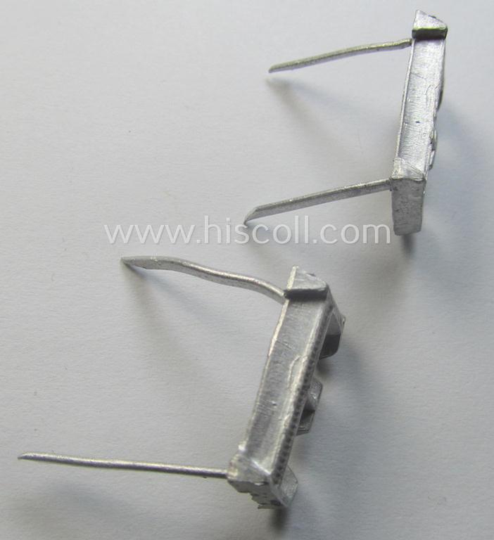 This is an attractive - fully matching and with certainty scarcely encountered! - pair of NCO-type- (thus silver-coloured and aluminium-based) Waffen-SS- (ie. SS-VT-) related shoulderstrap-cyphers (ie. 'Schulterstückauflagen o. Ziffern') depicting a capital (Latin-styled) 'E'-character as was specifically intended for usage by an NCO serving within the: 'Ergänzungsstellen der Waffen-SS'. The pair on offer here was (I deem) simply never used nor shoulderstrap-attached and can easily be graded as 'virtually mint-/unissued'. The pair is in all facets matching and comes mounted onto its functional (ie. never bent- and also aluminium-based) prongs. Both cyphers do show some minimal age ie. tarnish simply caused by decades of storage only. It should be noted that these (merely for the-) Waffen-SS (ie. 'SS-Verfügungstruppen') intended shoulderstrap-cyphers can easily be graded 'very scarce'. I deem that is a neat - and unusually encountered! - 'Schulterstückauflage-Satz' as was specifically intended for usage by an 'SS-Unterführer' ie. NCO serving within the: 'Ergänzungsstellen der Waffen-SS'!