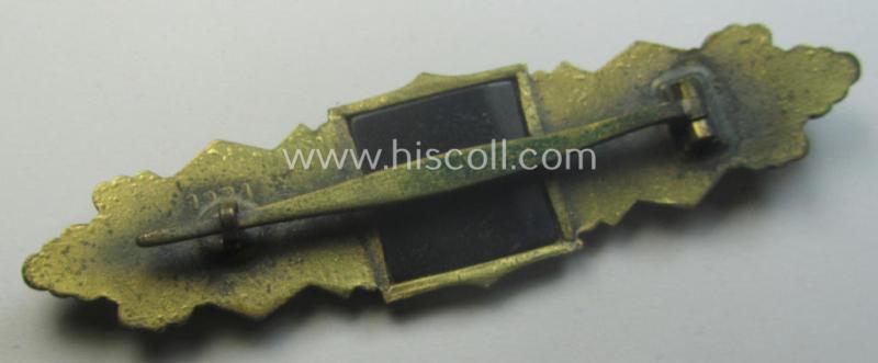 This is a truly very attractive - and I deem just minimally used- and/or worn! - example of a so-called: 'Nahkampfspange in Bronze' (or bronze-class close-combat clasp ie. CCC) being a neatly maker- (ie. 'F.&B.-L.'-) marked- and/or minimally converse-shaped version (by the desirable maker- ie. 'Hersteller': 'Funcke u. Brüninghaus') and that comes in an overall very nice- (and I deem only minimally used ie. worn-), condition. The piece - which has a very detailed and/or pronounced appearance - is as stated a neatly maker-marked version bearing the (as always 'upside-down-positioned'!) makers'-designation- (ie. logo: 'F.&B.-L.') on its back denoting that this is a piece as was produced by the: 'Funcke u. Brüninghaus'-company based in the town of Lüdenscheid. The 'Spange' is as stated a minimally converse-shaped example that comes mounted onto its (fully functional- and typical bronze-coloured) flute-shaped pin (and/or typical 'flat-wire'-type catch- ie. catch-set-up) both which are of course still present, unaltered and/or fully functional. The clasp truly retains almost all of its original golden-bronze-toned finish whereas the 'crimped' (and still neatly black-coloured) metal-based 'back-plate' is naturally also present and firmly in place (as can be noticed on the pictures). A similar example is also described in the excellent reference-book entitled: 'The German Close Combat Clasp of World War II' by my friend Thomas M. Durante wherein this particular pattern is given the unique reference-numeral : '3.2. - F &BL - “2nd Pattern - Flatwire Catch'. The piece was found as such at a private-household in Germany and was never before part of a collection. Simply a very attractive and hardly used example of a bronze-class 'Nahkampfspange' by 'F.&B.-L.': it should be noted that original examples of this neat combat-award are nowadays getting hard to find. I deem that I priced this example according to its overall very nice and/or fully untouched, condition!