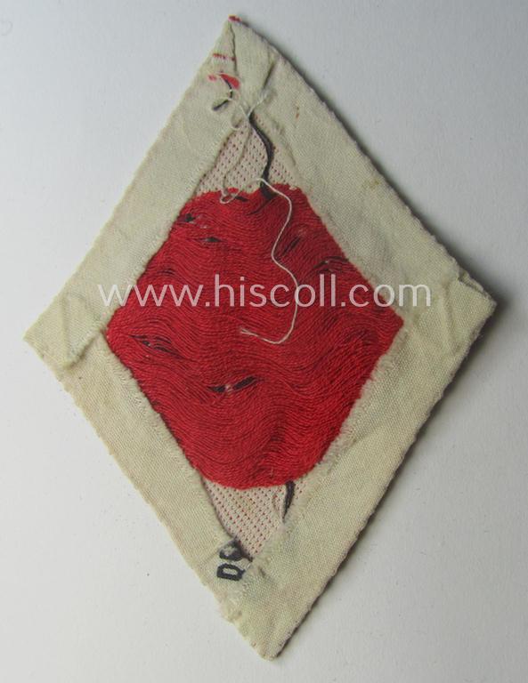This is an attractive - and actually fairly scarcely encountered! - early-pattern (and specifically female-related!) armbadge (ie. 'Ärmelabzeichen o. Ärmelraute') as was specifically intended for usage by a female member who served within the: 'Deutscher Frauenarbeitsdienst' (or: women's labour-service) and that comes in an overall nice- (and most certainly worn- and/or once tunic-attached- ie. carefully tunic-removed-), condition. The neat badge - which is somewhat shaped as a regular 'HJ-Raute' - measures (folded ie. trimmed) 9,5 x 7,2 cms. and shows a black-coloured swastika-sign surrounded by some cornflowers on a red- and white-coloured background. These 'BeVo'-woven-type badges were to be worn on the left upper-arm. The 'Deutscher Frauenarbeitsdienst' was the predecessor of the later-founded: 'RADwJ' (or: 'Reichsarbeitsdienst des weiblichen Jugend'). Simply a very attractive, early-period- and female-related TR-related 'Ärmelabzeichen' that will be very hard to be upgraded and that is with certainty accordingly priced!