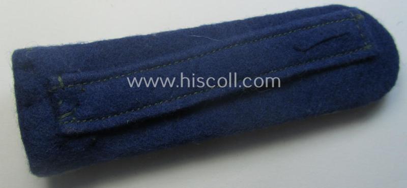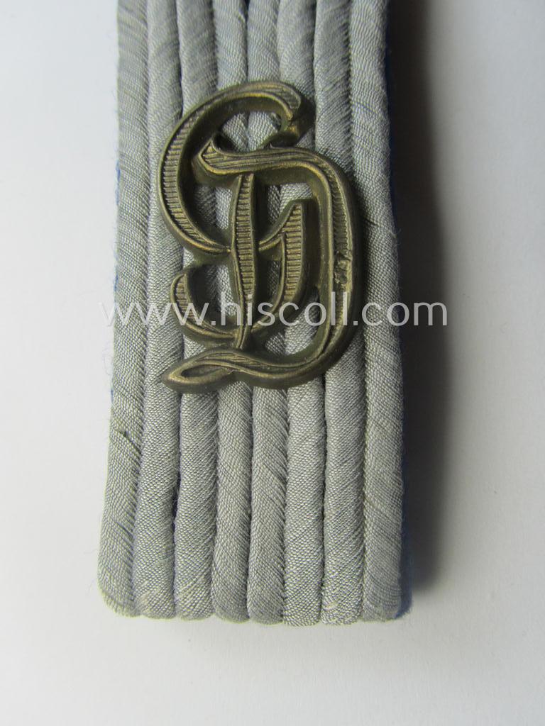 This is a very desirable - albeit regrettably single but nevertheless scarcely seen! - WH (Heeres) officers'-type, 'cyphered' shoulderboard as piped in the desirable darker-blue- (ie. 'blauer'-) coloured branchcolour (as constructed from the typical 'smooth-type' wool and that is showing a rarely observed, regular-sized and/or minimally tarnished, golden-toned 'GD'-cypher period-attached as was intended for usage by a: 'Leutnant u. Arzt der Sanitäts-Truppen' (ie. medical lieutnant and possibly doctor) who served within the famous 'GrossDeutschland'-division and that comes in an overall very nice- (albeit clearly used and/or carefully tunic-removed-), condition. The neat shoulderboard - which is piped in the darker-blue- (ie. 'blauer'-) coloured wool - is executed in the 'smooth-type'-wool and comes mounted onto its typical tongue attached. The board - which is approximately 10,4 cms. sized in length - has a greyish (ie. truly sub-dued) 'upperdeck' and shows the obvious signs of having been worn ie. having been once tunic-attached (it shows some minimal wear and/or usage). As stated above, does the board show a non-magnetic, regular-sized and/or (minimally tarnished) golden-toned, so-called: 'GD'-cypher period-attached denoting the officers'-rank of a: 'Leutnant' (ie. lieutnant). The 'cypher' retains both its prongs (as can be seen on the back of the board). This board originates from a larger cloth- and insignia-collection that I recently acquired for the web-site - was surely intended to be used onto a 'regular, front-used'-tunic. Simply a very attractive - and truly scarcely encountered! - neatly 'cyphered', officers'-type shoulderboard that shows lots of character and that belonged to a 'Sanitäts'-officer who served within a famous WH 'elite'-regiment: too bad that it is only a single specimen!