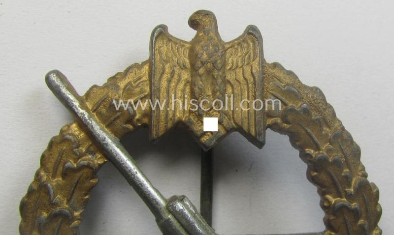 This is an attractive example of an - I deem - somewhat later-war-period, WH (Kriegsmarine) 'Marine-Artillerie-Abzeichen' (or: coastal-artillery war-badge) being a non-maker-marked- and/or typical zinc- (ie. 'Feinzink'-) based example as was (in my opinion) produced by the: 'Friedrich Linden'-company as was based in the town of Lüdenscheid and that comes in an overall very nice- (albeit I deem just moderately used- ie. worn-), condition. The award retains its typical catch- and/or hinge (-set-up) and comes naturally mounted onto its typical (steel-based- and/or thin-shaped-) pin: it also has a functional and unaltered hinge- and/or catch in place as to be expected: these are both not altered nor damaged and of course fully functional. The badge - which still has maintained pronounced detail - has never been cleaned nor polished and truly retains almost all of its (golden- ie. greyish-silver-toned) finish something that is not always the case (as can be seen on the pictures). This particular piece originates from a private-household in Germany where it was recently found. I deem that I have priced this attractive - and presumably by the: 'Friedrich Linden'-company-produced- and completely untouched! - 'Küstenartillerie'-related-award, accordingly!