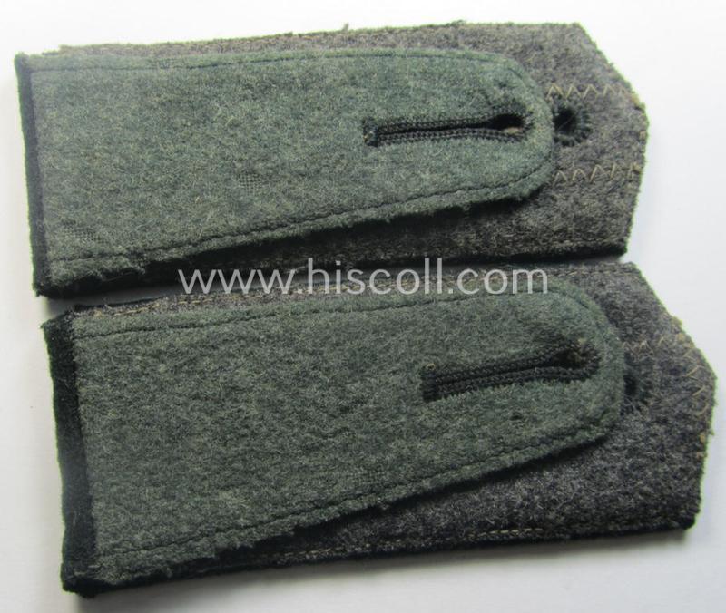This is a truly very attractive - fully matching and with certainty very scarcely found! - neatly 'cyphered' and/or typical 'pointed-styled', WH (Heeres) early- (ie. pre-war-) period- (ie. 'M36'- ie. 'M40'-pattern) enlisted-mens'-type shoulderstraps (ie. 'Schulterstücke für Mannschaften des Heeres') being a pair having no branchcolour ie. piping as per regulation as was specifically intended for usage by a: 'Soldat des Panzerschützen-Regiments 4' (or: simple soldier who served within the tank-gunners unit ie. regiment, numbered: '4') and that comes in an overall very nice- (ie. I deem just minimally used- and most certainly worn- and/or carefully tunic-removed-), condition. The neat straps - which have the 'standard'-pattern, darker-green-coloured and/or 'smooth woolen'-based 'upperdecks' and that measure approximately 11 cms. in length each - are as per regulation void of any piping as always (as can be seen on the pictures). The straps come mounted onto their functional tongues and show the neat (machine-embroidered by means of so-called: 'Kurbelstickerei') Gothic-styled, 'S'-cyphers and '4'-numerals (ie. 'Ziffern') (which are all four executed in the bright-pink- ie. 'rosaroter'-coloured wool ie. linnen as to be expected). The straps only show minimal wear and/or age and are just very nicely preserved (as can be seen on the pictures). I deem this an excellent occasion to acquire a neat - and most certainly very desirable and truly rarely found! - neatly 'cyphered', EM-type, 'Panzerschützen'-related shoulderstrap-pair for a justified price!