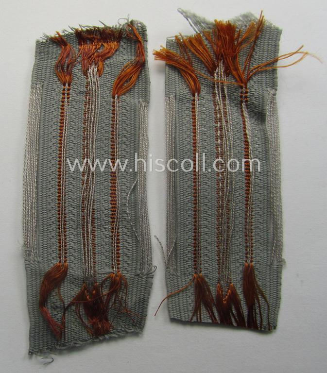 The neat - 'all-linnen'-based and/or fully matching! - pair of 'Gendarmerie' (ie. police) mid- (ie. later-) war-period- and/or: 'standard-issued'-pattern collar-tabs (or: 'Einheitskragenspiegel für Mannschaften u. Unterführer der Gendarmerie') being of the desirable 'generic-pattern' which are piped in the typical, bright-orange-coloured (ie. 'generic'-style) branchcolour having an equally bright-orange-coloured 'centre-stripe'and were as such intended for usage by all soldiers (ie. NCOs) within all 'Gendarmerie'-related branches of the: 'Deutsche Wehrmacht' troughout the war. The tabs come in an overall very nice- (ie. 'virtually mint- ie. unissued'-) condition and were simply never used- nor tunic-attached (as can be seen on the pictures). Both tabs just show some minimal storage-age only and came as 'straightly cut-off the role' (as can be seen on the pictures). These pairs saw wide-spread usage throughout the 'Deutsche Wehrmacht' and were directly sewn to the collar (without having a 'backing'). As such is the set on offer here a great pair to complete any police-tunic or to be simply stored in any insignia-collection!