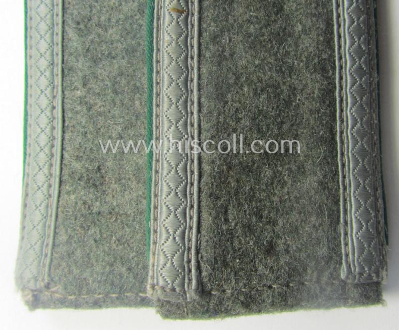 This is a very attractive - fully matching and actually truly very scarcely found! - pair of WH (Heeres) early- (ie. mid-) war-period, so-called: 'M40- o. M43'-pattern NCO-type shoulderstraps as piped in the darker-green- (ie. 'grüner'-) coloured branchcolour as was intended for - and minimally worn by! - an: 'Unteroffizier eines Gebirgsjäger- o. Jäger-Regiments' (or: NCO and/or junior-sergeant who served within an army mountain-troops-regiment) and that comes in an overall very nice- (albeit moderately used ie. worn- ie. carefully tunic-removed-), condition. The regular-sized shoulderstraps - which are approximately 11,8 cms. sized in length - shows the bluish-grey-toned (ie. sub-dued) NCO-braid attached and have the 'standard-type'- and/or field-grey-coloured, woolen-based 'upperdecks'. The straps - which have the the darker-green- (ie. 'grüner'-) coloured- and/or (desirable!) 'silk-like'-type piping attached - came mounted onto their functional tongues and do show as stated above just minimal usage and/or wear (some minor staining and/or dust is visible and/or present). It should be noted that all 'Gebirgsjäger o. Jäger'-related, WH (Heeres) NCO-type shoulderstraps can easily be regarded 'truly scarce'. Simply an attractive and/or: early- (ie. mid-) war-period, 'Heeres'-related NCO-type shoulderstrap-pair that was intended for usage by an: 'Unteroffizier eines Gebirgsjäger- o. Jäger-Regiments'!