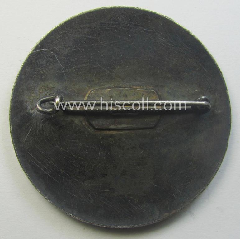 This is an attractive - and actually very nicely executed ie. luxuriously-styled and/or I deem typical 'Buntmetall'-based! - so-called: N.S.D.A.P.-related 'tinnie' (ie. 'Tagungs- o. Veranstaltungsabzeichen') being a non-maker-marked example showing the text: 'Vereidigung der Niederschlesier - Liegnitz - 25.2.1934' and that comes in an overall nice- (I deem issued, moderately worn- and/or just minimally stained-), condition. The piece is executed in silver- (ie. black-) coloured metal (I deem typical 'Buntmetall'): it does show some obvious (handling) age but has never been cleaned nor polished (it is still a bit dirty but has maintained a nice, somewhat tarnished, age-patina). The 'tinnie' comes mounted onto its functional pin-/catch set-up and shows some minimal age ie. staining (as can be seen on the pictures). The circular-shaped piece has an approximate diameter of only 3,8 cms. and shows a (black-toned) swastika-sign coupled with the tekst as mentioned above. Simply a nice occasion to acquire an unusually found N.S.D.A.P.-related and neatly 'Buntmetall'-based, so-called: 'Tagungs- o. Veranstaltungsabzeichen' for an interesting price!