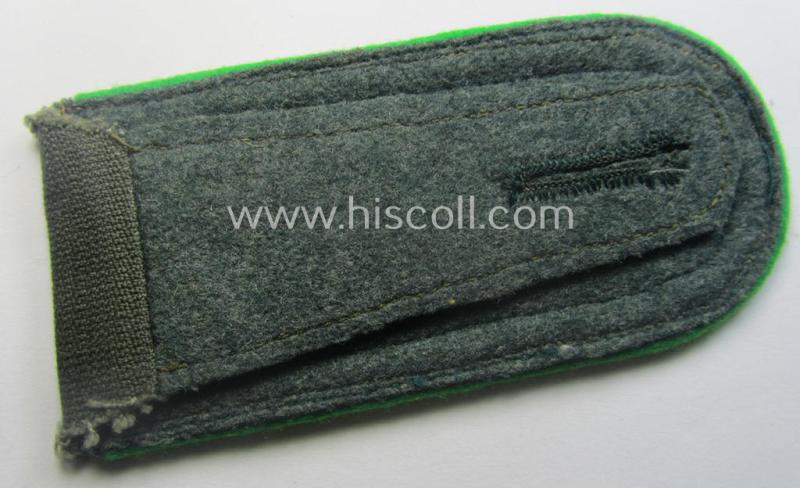 This is a very attractive - albeit regrettably single but nevertheless rarely found! - WH (Heeres) early- (ie. pre-) war-period, so-called: 'M36- o. M40'-pattern- (rounded-styled) neatly 'cyphered'- and/or darker-green- (ie. grüner-) piped, NCO-type shoulderstrap (as executed in early-styled so-called: 'Reichswehr'-period linnen!) as was intended for - and clearly worn by! - an: 'Unteroffizier des Gebirgsjäger-Regiments 139' (or: NCO and junior-sergeant who served within the army mountain-troops-regiment, numbered: '139') and that comes in an overall nice- (albeit moderately used ie. worn-), condition. The somewhat broader-shaped shoulderstrap - which measures approximately 11 cms. sized in length - does show the greenish-coloured- and/or linnen-based (ie. HBT-styled) 'upperdeck' and has the woolen-type piping attached. Moreover, does it show the neatly machine-embroidered and also darker-green-toned: '1'-, '3'- and/or '9'-cyphers ie. numerals (or: 'Ziffern') (which are excuted in so-called: 'Kurbelstickerei' as can be seen on the pictures). The strap - which came mounted onto its functional tongue - shows as stated above some moderate usage and/or wear (some minor staining and/or dust is visible and/or present). It should be noted that all 'cyphered'-pattern, WH (Heeres) 'Gebirgjäger'-related shoulderstraps can easily be regarded 'fairly scarce'. This strap originates from an older 'Gebirgjäger'-related shoulderstrap ie. board-collection that I recently acquired for the web-site. Simply a very attractive and/or: early-war-period, neatly 'cyphered' and/or 'Heeres'-related NCO-type shoulderstrap that was intended for usage by an: 'Unteroffizier des Gebirgsjäger-Rgts. 139' (part of the: '3. Gebirgs-Division')!