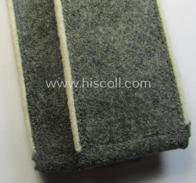 This is a truly attractive - and nowadays quite scarcely found! - pair of WH (Heeres) enlisted-mens'-type, so-called: 'M40'- (ie. 'M43'-) pattern shoulderstraps as was intended for a: 'Soldat der Infanterie-Truppen' (or: simple soldier who served within an infantry-unit) and that comes in an overall very nice- (I deem just moderately used- and/or carefully tunic-removed-), condition. The truly attractive straps - which that measure approximately 11,8 cms. in length each as more often encountered - have the 'standard-type'- and/or typical field-grey-coloured- and/or woolen-based 'upperdecks' and show the neat white- (ie. 'weisser'-) coloured and/or (typical) woolen-type piping, attached. The straps were just moderately used- and/or worn and do show some obvious age, wear and staining (as can be seen on the pictures). They come naturally mounted onto their functional tongues and are in my opinion a typical, 'standard-issued'- (ie. non-privately-purchased') pair. It should be noted that these early- (ie. mid-) war-period 'Infanterie'-related EM-type shoulderstrap-pairs are with certainty not that easily encountered and can be graded 'fairly scarce'. This particular pair - which is as stated above fully matching and that was most certainly worn as such as a pair - originated from an older cloth- and/or shoulderstrap-collection I recently acquired for the web-site. Simply a very attractive pair of early-war-period so-called: 'M40- (ie. 'M43'-) pattern' enlisted-mens'-type shoulderstraps that was intended for a: 'Soldat der Infanterie-Truppen'!