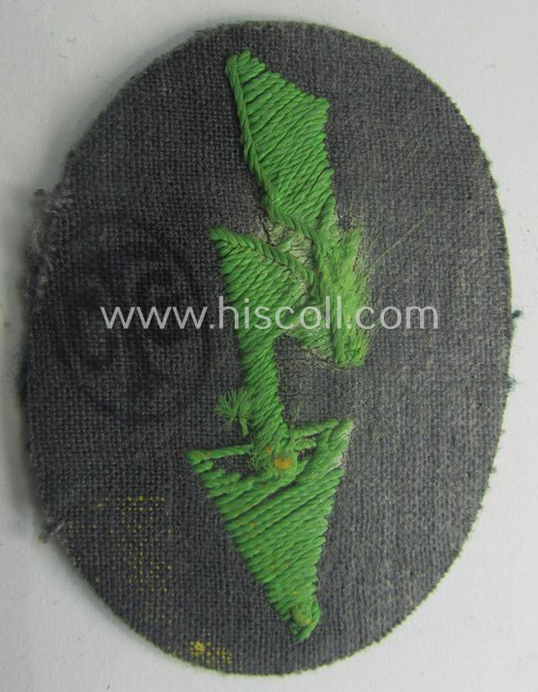This is an attractive - and I deem simply never used! - example of a so-called trade- and/or special-career insignia (ie. 'Signal Blitz') as was executed in the bright-green- (ie. 'wiesen- o. hellgrüner'-) coloured branchcolour as was intended for a 'signals-operator' (or: 'WH-Nachrichtenpersonal') ie. soldier serving within the: 'Panzer-Grenadier-Truppen'- (ie. infantry-related, so-called: rifle-regiment ie. unit) and that comes in an overall very nice- (I deem never worn- ie. 'virtually mint'-), condition. The patch is neatly hand-embroidered on darker-green-coloured wool and shows no defaults whatsoever. The 'Blitz' is bright-green- (ie. 'wiesen- o. hellgrüner'-) coloured and was as such intended for a: 'Panzer-Grenadier'-soldier. The patch - that shows a inked makers'-designation that reads: 'CTG' on its back as more often - shows some minimal storage-age and/or staining only. This example is additionally 'backed' with a piece of greyish-blue-coloured linnen as more often seen. Simply a very attractive - and scarcely found! - 'Signal-blitz' that is very hard to be upgraded!