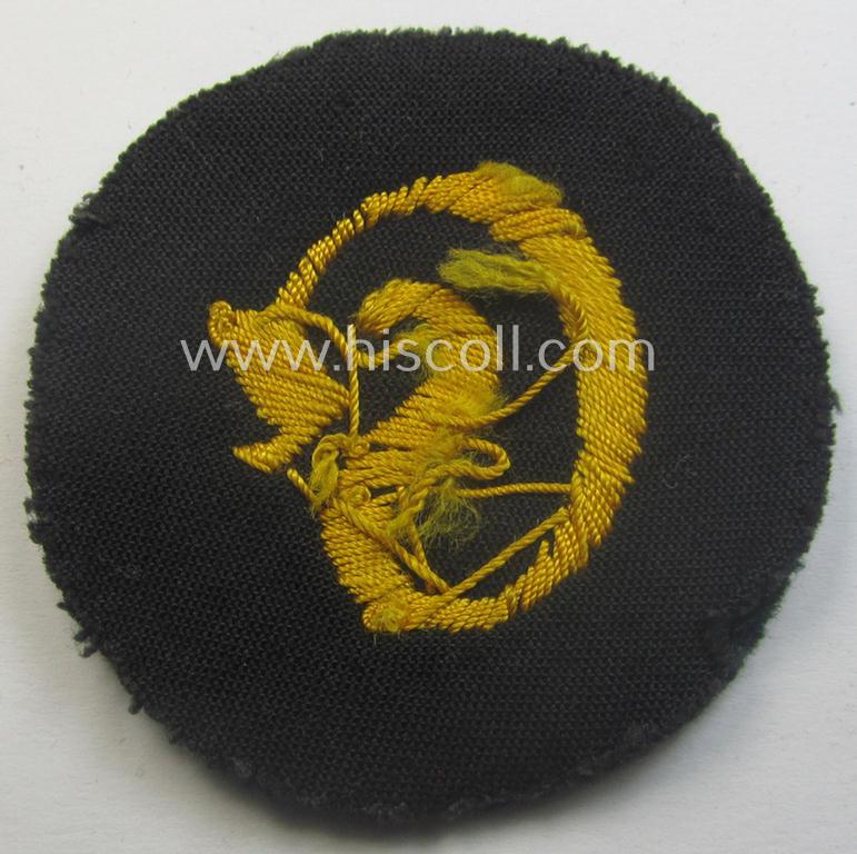 This is an attractive - and truly used- and/or tunic-removed! - example of a WH (Heeres) so-called: trade- and/or special-career arm-insignia (ie. 'Laufbahn- o. Tätigkeitsabzeichen') as was specifically intended for a: 'Schirrmeister' (or: equipment-administration staff-member ie. NCO) being a neatly hand-embroidered variant that comes mounted onto a darker-green-coloured and typical woolen-based background and that comes in an overall nice- (I deem just moderately used-), condition. The neat patch is executed on darker-green-coloured wool and shows a detailed (and neatly hand-embroidered!) Gothic-styled 'G'-character. The patch - which is backed with black-coloured linnen-based cloth as more often - denoted that the soldier ie. NCO who wore it (ie. for whom it was intended) had succesfully passed several tests and could therefore be regarded as a: 'Schirrmeister'. The patch - which is totally void of a makers'-designation on its back - shows some minimal age, wear and/or staining. Simply an attractive - and truly wornn! - WH (Heeres) trade- and/or special-career arm-insignia (ie. 'Laufbahn- o. Tätigkeitsabzeichen')!