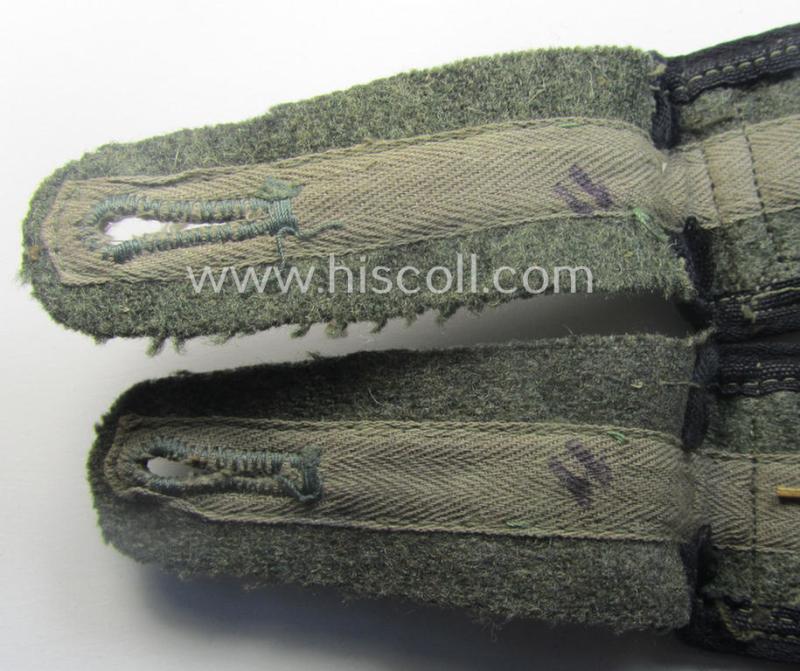 This is a truly very attractive - fully matching and with certainty very scarcely encountered! - typical later-war-period, so-called: 'M44'-pattern- and somewhat 'simplified', WH (Heeres) NCO-type shoulderstraps as was piped in the black- (ie. 'schwarzer'-) coloured branchcolour as was specifically intended for usage by a: 'Feldwebel der Pionier-Truppen u. Mitglied des Pionier-Regimentsstabs 34' (or: NCO ie. sergeant who served within the engineer-troops-related, regimental staff-unit numbered: '34') and that comes in an overall very nice- (I deem just moderately used- and/or worn-), condition. The neat shoulderstraps - which measure approximately 11,5 cms. in length each as more often seen - have the neat (and desirable!) 'silk-like'-type piping attached (as is more encountered with these later-war-period shoulderstraps). The shoulderstraps - that came with a pair of field-grey toned tunic-buttons attached - are constructed following the typical '1944 cloth-minimising production-manner', using different shades of wool and/or material (as can be seen in the pictures). The straps - that came with a pair of field-grey-coloured- and pebbled-style tunic-buttons attached - show the silverish-coloured (ie. non-sub-dued) NCO-braid attached and come mounted onto their functional tongues. The shoulderstraps show two pairs of (matching, early-styled, larger-sized and aluminium-based) so-called: '3'- and/or: '4' cyphers (ie. 'Ziffern') and a pair of (greyish-toned, zinc-based) pips period-attached, denoting the NCOs rank ie. function as mentioned above. It should be noted that all 'M44'-pattern, NCO-type straps are actually quite hard to find and can easily be graded 'scarce': even more so when they are piped in the desirable, black- (ie. 'schwarzer'-) coloured branchcolour. Of additional interest is, moreover, the fact that both straps show an inked '11'-numeral on the inside of the tongues (as can be noticed on the pictures). Simply an attractive - and/or fully 'text-book'! - M44-pattern NCO-type 'Pioniere'-shoulderstrap-pair that was intended for usage by a: 'Feldwebel der Pionier-Truppen u. Mitglied des Pionier-Regimentsstabs 34'!