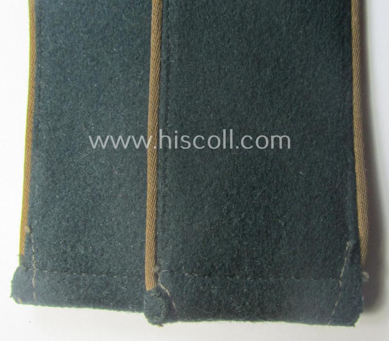 This is a truly very attractive - and actually very rarely encountered! - pair of WH (Heeres), pre- (ie. early-) war-period- (ie. 'M40'-pattern, rounded-styled) enlisted-mens'-type shoulderstraps as piped in the very desirable, copper-brown- (ie. 'kupferbrauner'-) coloured branchcolour as was intended for - and just moderately used by! - a: 'Soldat der Kradschützenbtle. der Pz.Div. u. Inf.Div. (mot)' (or: simple soldier who served within a tank- ie. infantry-related, motor-cycle unit) and that comes in an overall very nice- (albeit just moderately used ie. worn-), condition. The straps - which I deem are of the early- (ie. pre-war-) period ie. so-called: 'M40'-pattern - have the darker-green-coloured 'upperdecks' and have the neat, reddish-copper-brown- (ie. 'kupferbrauner'-) coloured and/or 'silk-like'-type piping attached (as can be seen on the pictures). The straps - which are regular-sized and that measure 12 cms. in length each - come naturally mounted onto their original tongues. This truly rarely seen pair originated from an older shoulderstrap-collection I recently acquired for the web-site. As possibly known, is this typical 'kupferbrauner'-branchcolour very rarely seen and can most certainly be regarded as one of the most rarely encountered branchcolours within the 'Deutsche Wehrmacht': original EM-type pairs are almost never offered for sale and are missing in most shoulderstrap-collections. The pair on offer here just shows some minimal age, wear and or staining (as can be seen on the pictures). Simply a very attractive - and fully 'text-book'! - 'Kradschützen'-EM-type shoulderstrap-pair that will be very hard (ie. impossible) to be upgraded!