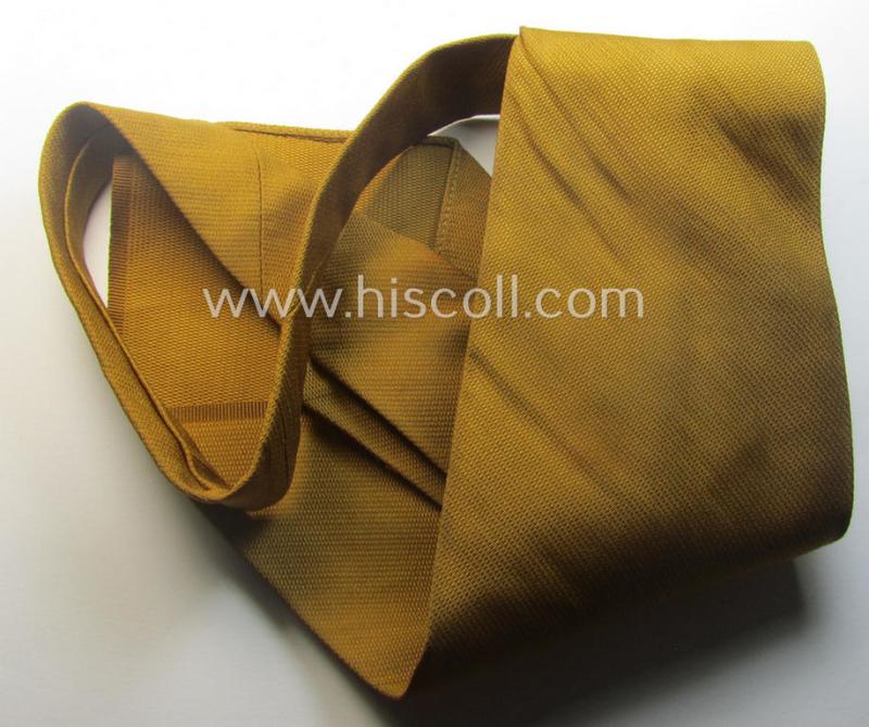 This is an attractive - quite desirable and actually truly scarcely seen! - example of a so-called: 'generic'-styled, N.S.D.A.P.- (ie. 'politischen Leiter'-related!) 'standard-issue'-pattern, mustard-brown-coloured and/or (structured) linnen-based tie ('Krawatte o. Binder') being a 'virtually mint- ie. unissued' example that still retains is period (linnen-based) 'RzM'-etiket. The piece is a truly 'text-book'-example that shows the typical white-linnen inner-piece (used to reinforce the tie) and has a re-enforced middle-section as prescribed by regulations. The piece shows some very minor staining and/or dust (just caused by decades of storage only). It should be noted that these genuine, political N.S.D.A.P.- (ie. 'politischen Leiter'-related-) pieces are with certainty not that often offered for sale and can easily be graded 'truly scarce'. Impossible to upgrade this example!