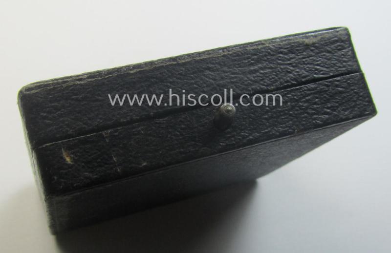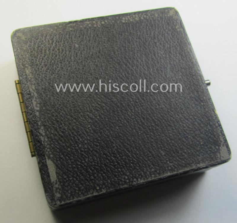 This is an attractive - albeit just moderately worn- ie. used - example of an: 'Eisernes Kreuz 1. Klasse' (or: Iron Cross 1st class) being a neat, albeit (typical) non-marker-marked example as was (I deem) produced by the desirable maker (ie. 'Hersteller'): 'B.H. Mayer's Kunstprägeanstalt' and that comes stored in its original, simulated leather-based etui as issued and/or recently found and that comes in an overall nice- (albeit moderately used- and/or worn-), condition. The magnetic cross has a nice (somewhat darkened) age-patina and retains truly great detail: the black core shows no rust nor damage whatsoever: the black paint is truly almost fully preserved (something that is not always the case). The typical (flute-shaped) pin and catch (ie. set-up) are naturally unaltered and/or fully functional. The etui – that shows a its 'broad-rimmed' cross on its top - comes also in a very fine and complete condition: the silver-rimmed cross that figures on the etui's top is in very nice and totally undamaged condition whereas the off-white- (ie. yellowish-beige-) coloured- and typical felt-like interior is also present and in place (it does show some minimal age and/or staining). The cross - which is a non-vaulted example as more often - is as stated above a non-maker-marked example that has never been cleaned: it is still a bit tarnished and comes as recently found at a German private-household. Simply an attractive - and matching! - IC1-set by the 'B.H. Mayer's Kunstprägeanstalt'-company and that was never before in a collection and that is most certainly accordingly priced!