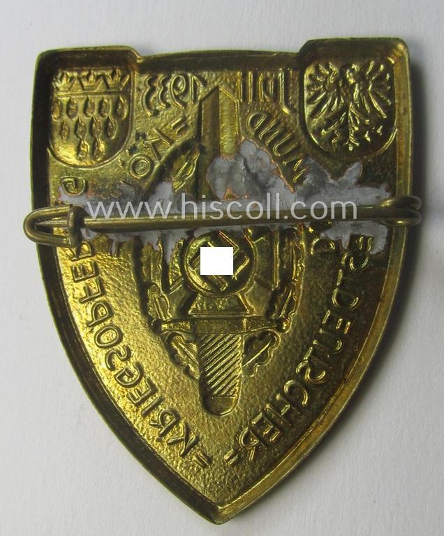 Commemorative, golden-bronze-toned and/or tin-based: 'N.S.K.O.V.'- (ie. veteran-) related 'tinnie' being a non-maker-marked example showing the text: '1. Westdeutscher - Kriegsopfertag - Dortmund - Köln - Juli 1933'