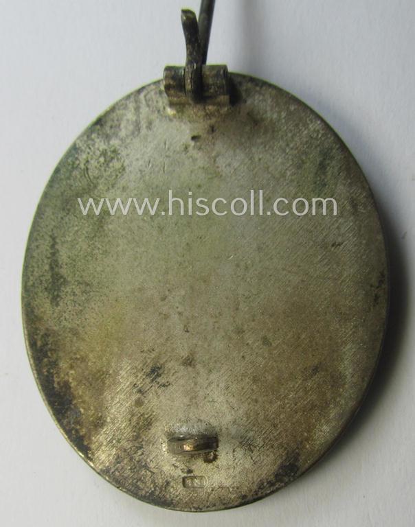 The attractive - and truly luxuriously styled! - silver-class wound-badge (or: 'Verwundeten-Abzeichen in Silber') is executed in neat silvered- (albeit somewhat tarnished- ie. worn) so-called: 'Buntmetall' and just shows some moderate (ie. minimal!) usage and/or wear (as can be seen on the pictures). The badge - which is non-magnetic as more often - comes naturally mounted onto its fully functional ('thin'-shaped- and totally unaltered) pin (which is of course fully functional) and comes mounted onto its functional and pristine catch (ie. catch-set-up). The badge is most certainly never cleaned and retains most of its silver-toned finish and shows some obvious tarnish ie. staining (it has, however, I deem never been cleaned nor polished though). It is - as stated above - a clearly maker- (ie. '13'-) marked example (stamped under the catch as to be expected) that is unmistaken an early-period- (and quality-procuded!) specimen that was produced by the maker (ie. 'Hersteller') named: 'Gustav Brehmer' (ie. 'Hersteller: 13') as was based in the town of Markneukirchen. Simply an attractive - and with certainty desirable! - luxuriously-styled, maker-marked silver-class WB that is accordingly priced!