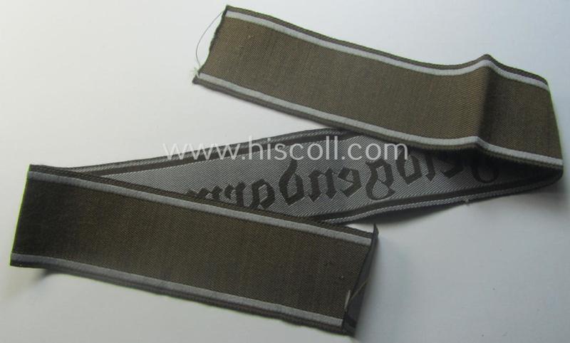 This is a truly very attractive - and I deem issued, albeit hardly used- nor once tunic-attached - example of a WH (Heeres) cuff-title ie. armband (ie. 'Ärmelstreifen') entitled: 'Feldgendarmerie' (being of the typical so-called: 'BeVo'-woven-pattern) that comes in an overall very nice- (ie. non-shortened- and/or full-length-), condition. The armband measures approximately 44 cms. in length and both ends (that were once folded) do show some minimal fraying as is more often encountered (something that can be seen on the pictures). The armband - which originates from a private-household in Germany where it was recently uncovered - was as such most certainly stored for decades and shows some age and/or minimal staining (as can be noticed on the pictures). The cuff-title that is of the typical so-called: 'BeVo'-woven-pattern is executed in the typical brownish-coloured linnen and shows the machine-stitched title in bluish-grey-coloured (and also linnen-based) thread as is more often encountered: as such does it deal with a typical example that was intended for enlisted-men (and NCOs) ie. being an: 'Ausführung für Unteroffiziere u. Mannschaften der Feldgendarmerie-Truppen'. Simply a very nice - and naturally 100% genuine! - period example that will be impossible to be upgraded and that is I deem accordingly priced!