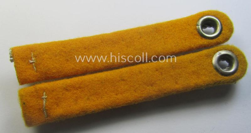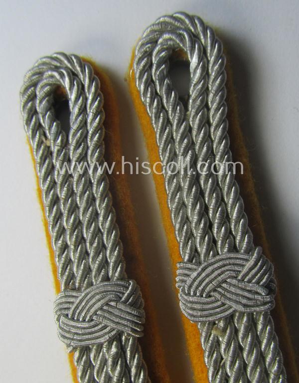 This is a very attractive - quite scarcely encountered and I deem hardly used- nor worn! - fully matching pair of (most certainly pre-war-period!), typical DLV- (ie. 'Deutscher Luftsportsverbandes'-) related officers'-type shoulderboards as was specifically intended for usage by a: 'DLV-Fliegeroberleutnant o. Schwarmführer' (or: lieutnant first-class) and that comes in an overall very nice- (and I deem hardly- ie. presumably never worn-), condition. The 'slim'-styled boards measure approximately 10,2 cms. in length and are executed in the golden- (ie. 'goldgelbener'-) toned and/or smooth-type wool and show a braid-based and silver-toned 'upperdeck' that has a single 'rank-bar' firmly attached denoting the officers'-rank of a: 'DLV-Fliegeroberleutnant o. Schwarmführer' (as can be noticed on the pictures). The boards were clearly intended as a pair of the 'sew-in'-pattern (and never had any tongues attached): both boards show a nickle-chrome-based 'ring' present to accomodate the buttons). Simply a neat pair of attractive 'DLV'-related officers-type boards that were intended for usage by a: 'DLV-Fliegeroberleutnant o. Schwarmführer': just the first such rarely seen DLV-pair I ever had on offer!