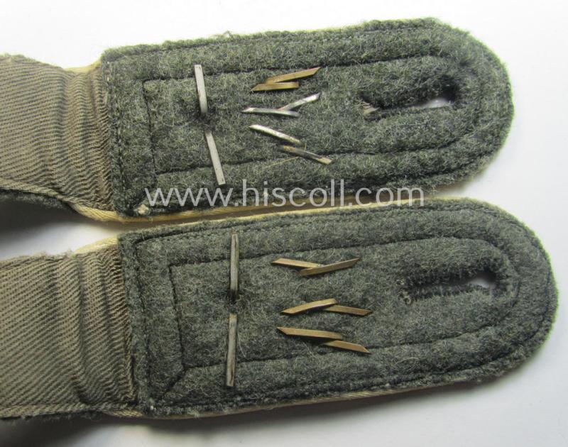 This is a very attractive - just moderately used- abeit nevertheless not that easily found and/or truly fully matching! - pair of WH (Heeres), early- (ie. mid-) war-period, so-called: 'M40'-pattern NCO-type shoulderstraps (ie. 'Schulterstücke für Unteroffiziere des Heeres') having the desirable white- (ie. 'weisser'-) coloured branchcolour as was specifically intended for usage by a: 'Feldwebel des Infanterie-Regiments 111' (being part of the '35. Infanterie-Division') (or: NCO ie. sergeant who served within the infantry-regiment, numbered: '111' being part of the infantry-division, numbered: '35') and that comes in overall very nice- (I deem just moderately used- and/or worn-), condition. The neat straps - which are both approximately 10,5 cms. sized in length - have the 'standard-pattern', darker-green-coloured- and/or woolen-based 'upperdecks' and have as stated above the white- (ie. 'weisser'-) coloured and desirable 'silk-like'-pattern piping attached (as can be seen on the pictures). The shoulderstraps have the greyish-silver-coloured (ie. minimally sub-dued-pattern) NCO-braid attached and do show two matching sets of (identical, smaller-sized and/or typical zinc-based) so-called: '1'-cyphers ie. numerals (or: 'Ziffern') and a (regular-sized- and zinc-based) pips, period-attached. All eight devices are nicely preserved but do show some obvious age and/or wear (as can be seen on the pictures). The pair came mounted onto its original tongues and does just show some minimal age-, wear and/or staining only. The shoulderstraps - which originate from a larger cloth- and insignia-collection I recently acquired for the web-site - are a typical 'standard-issued'- (ie. non-privately-purchased-) pair (as can be seen on the pictures). Simply a very attractive - and fairly early- (ie. mid-) war-period - 'Heeres' NCO-type, shoulderstrap-pair that belonged to a: 'Feldwebel des Infanterie-Regiments 111' (being part of the '35. Infanterie-Division'): I deem that I have priced this very attractive 'Infanterie'-related pair, accordingly!